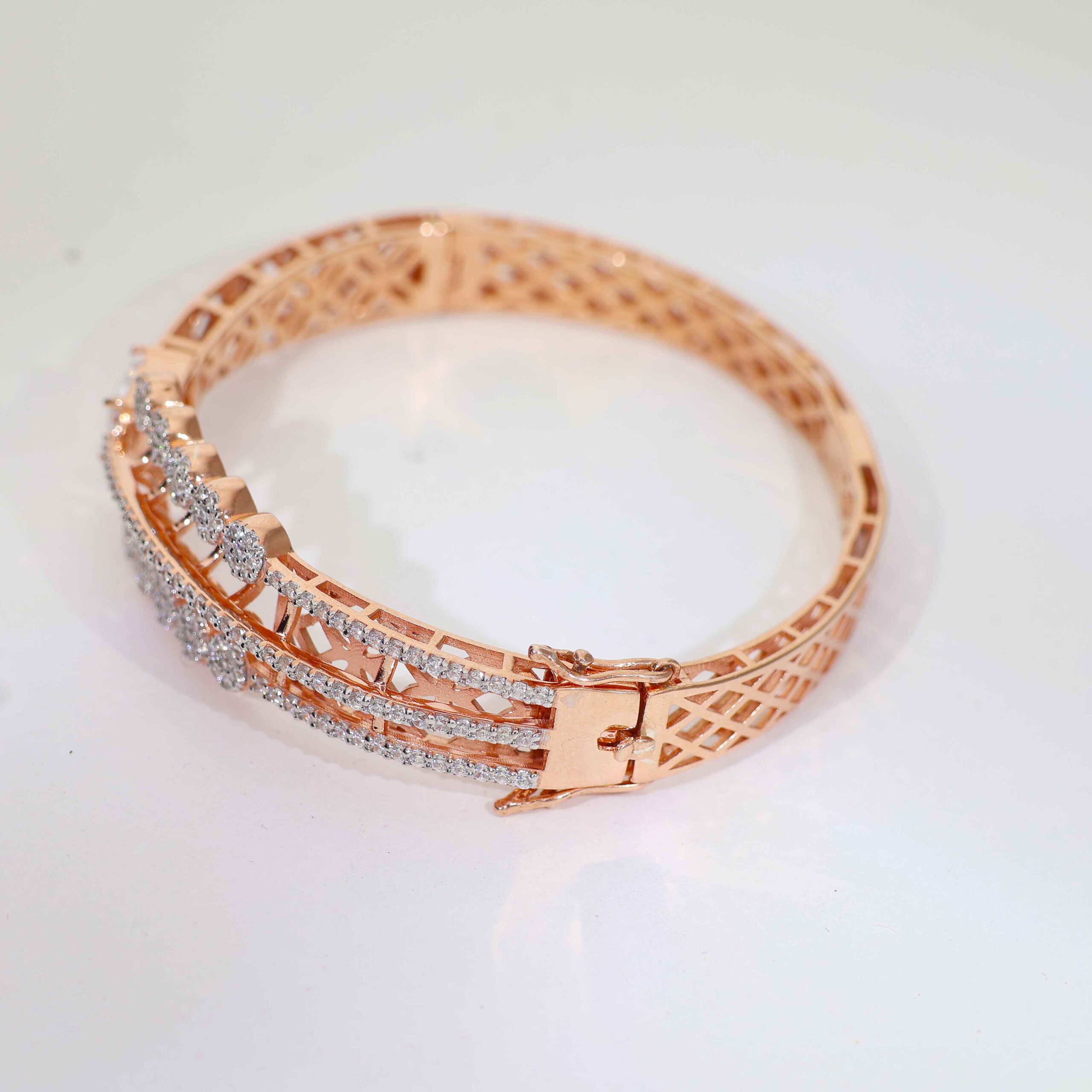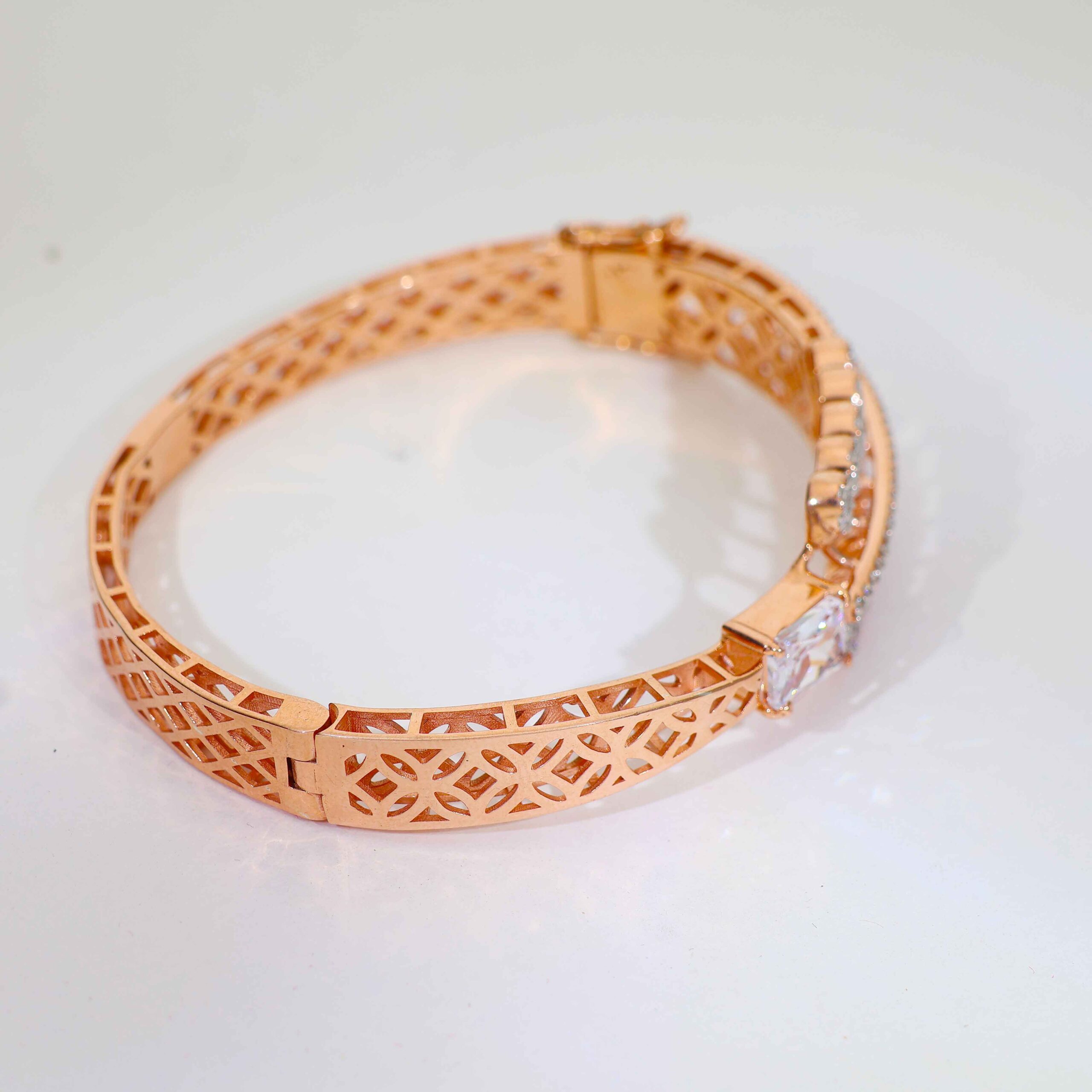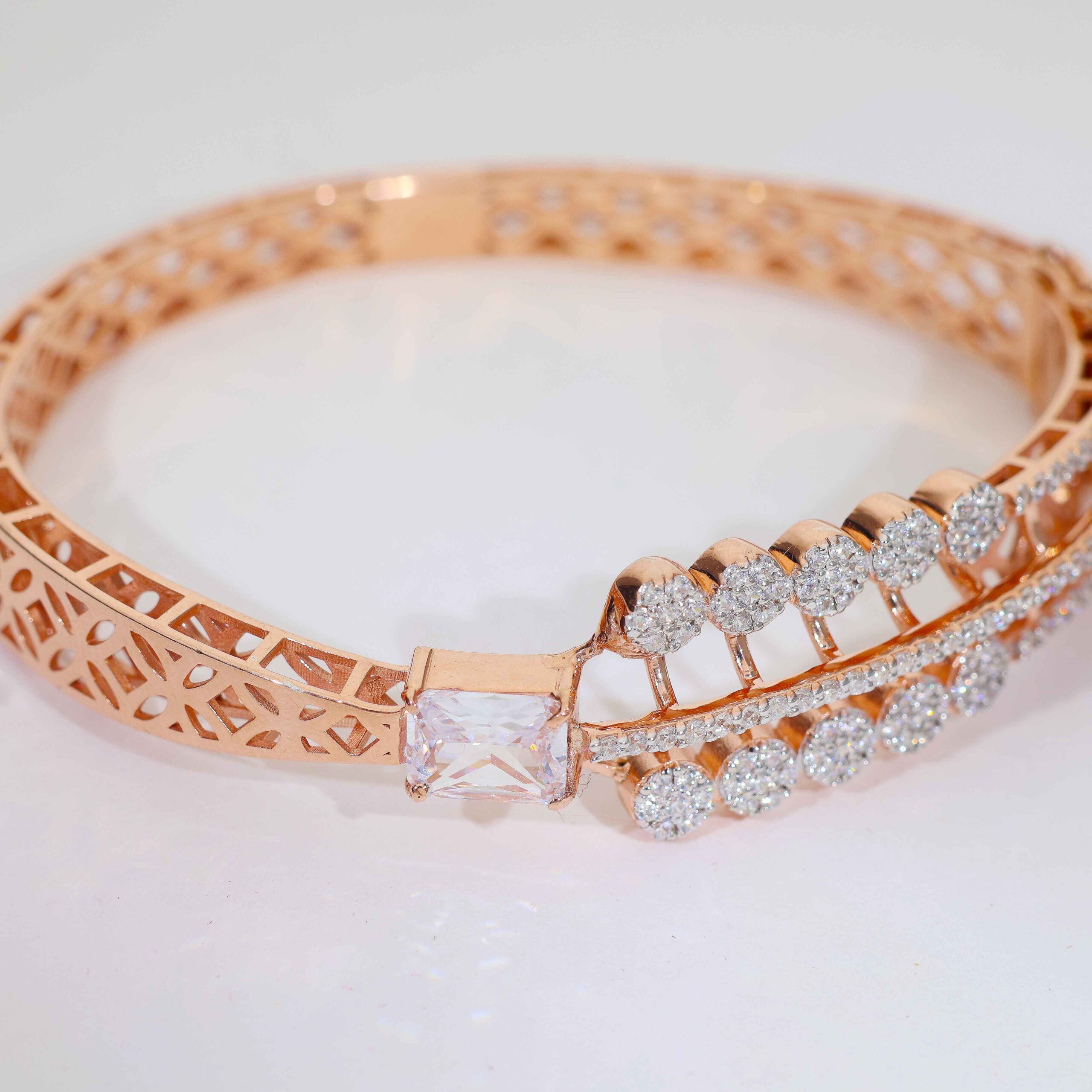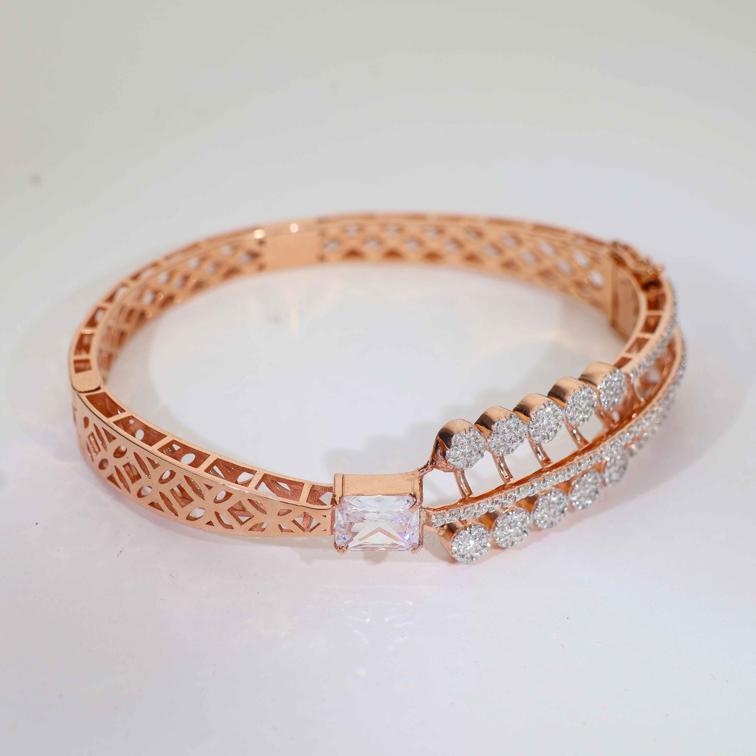 Design: Crafted in 92.5 silver with rose gold plating, this ladies kadha features one side with fine cutwork and the other side lined with round CZ stones and a single square stone in the center, giving a rich and stylish look.