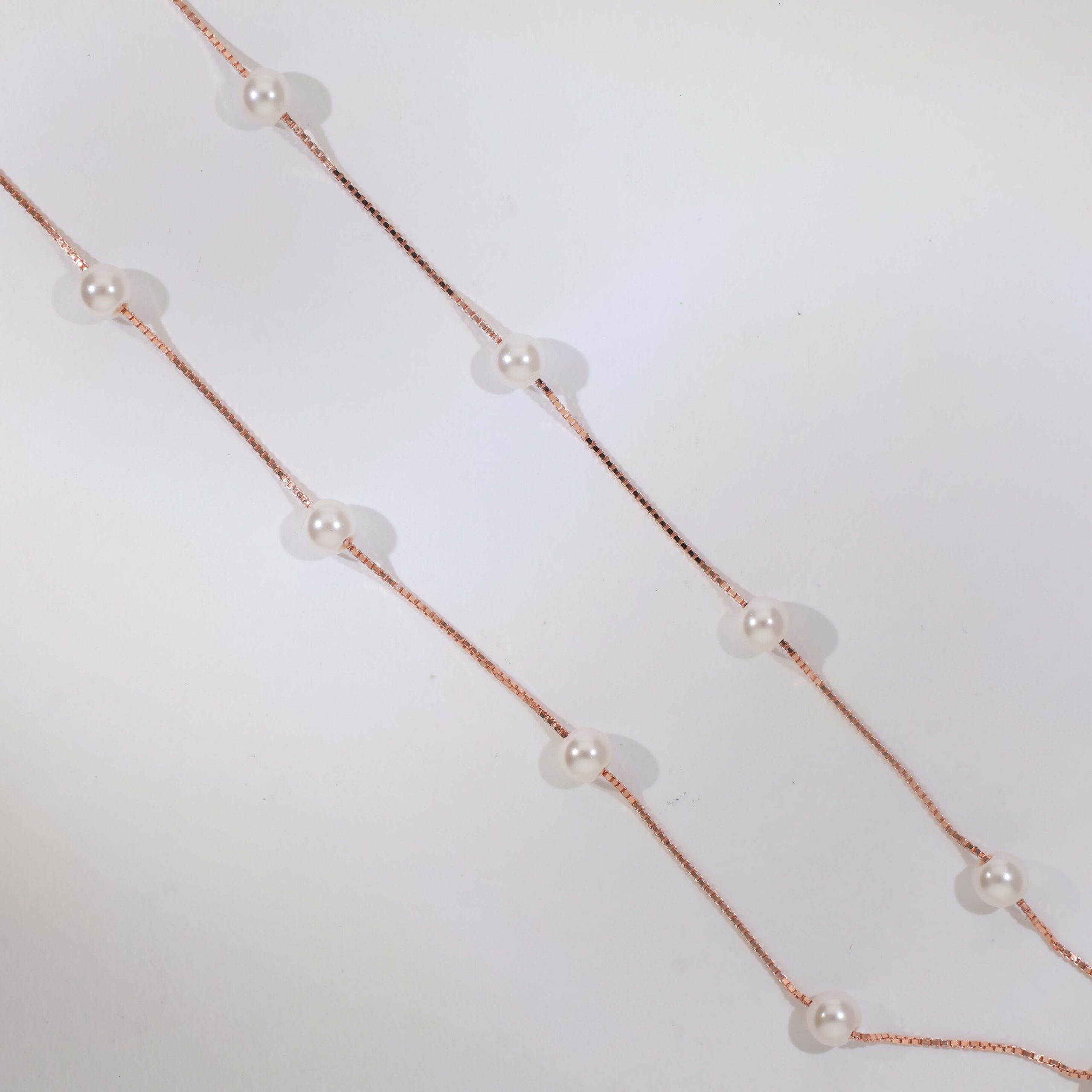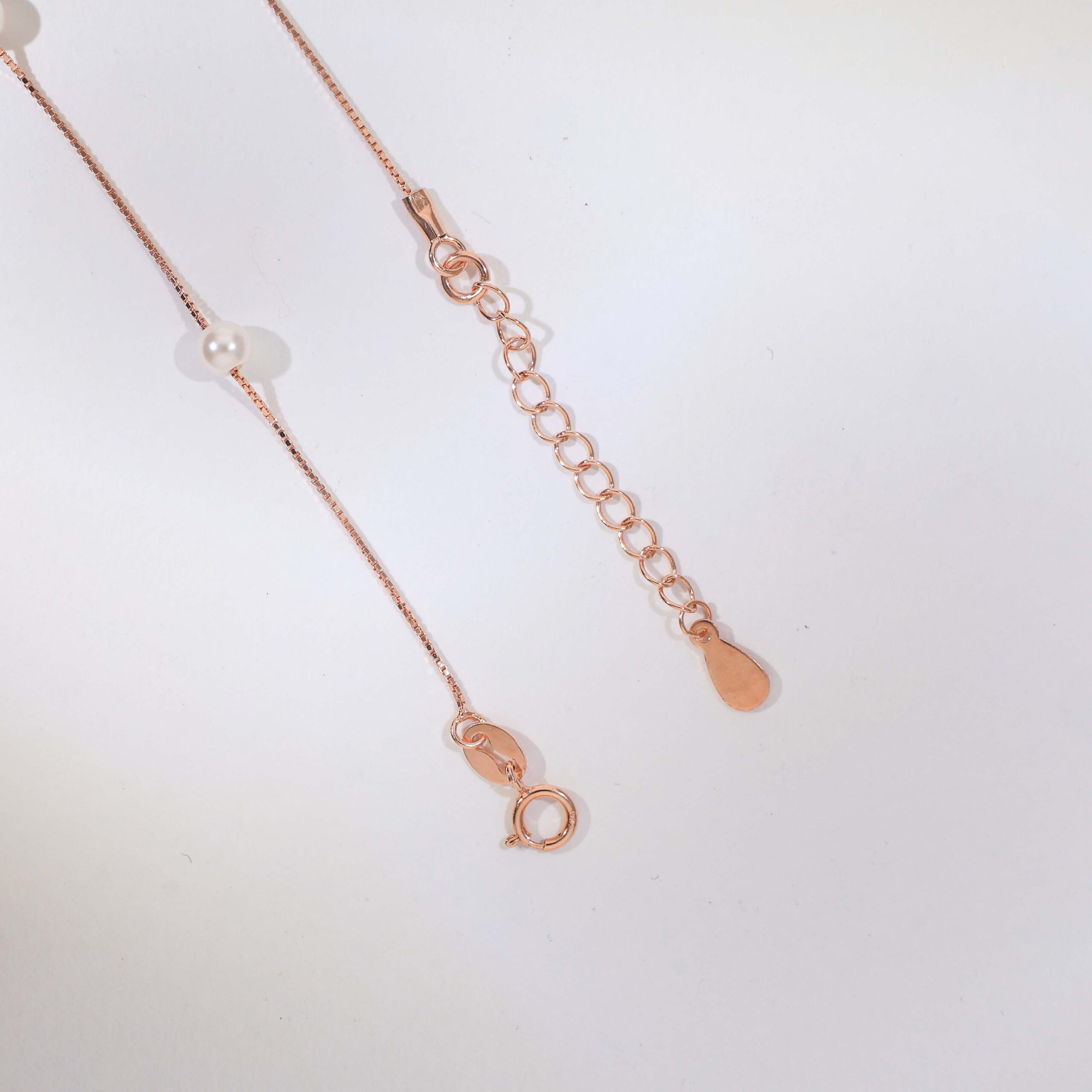 Design: Featuring pearl stations gently nested along a rosegold box chain, this piece is modern, versatile, and effortlessly romantic.