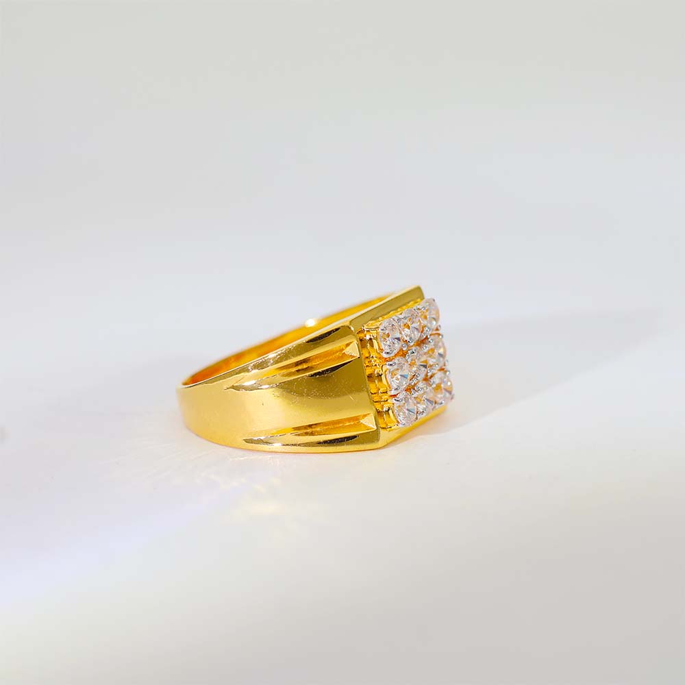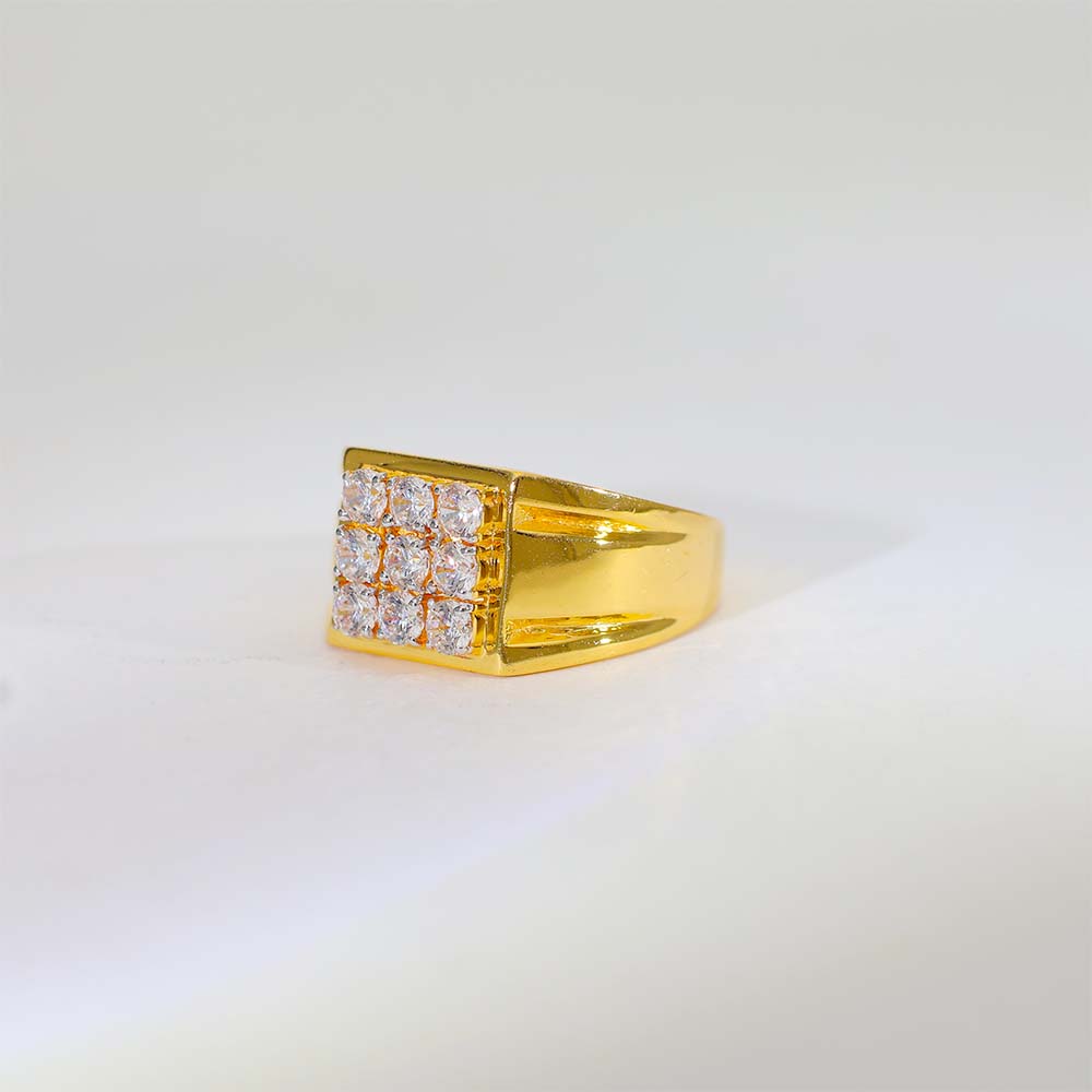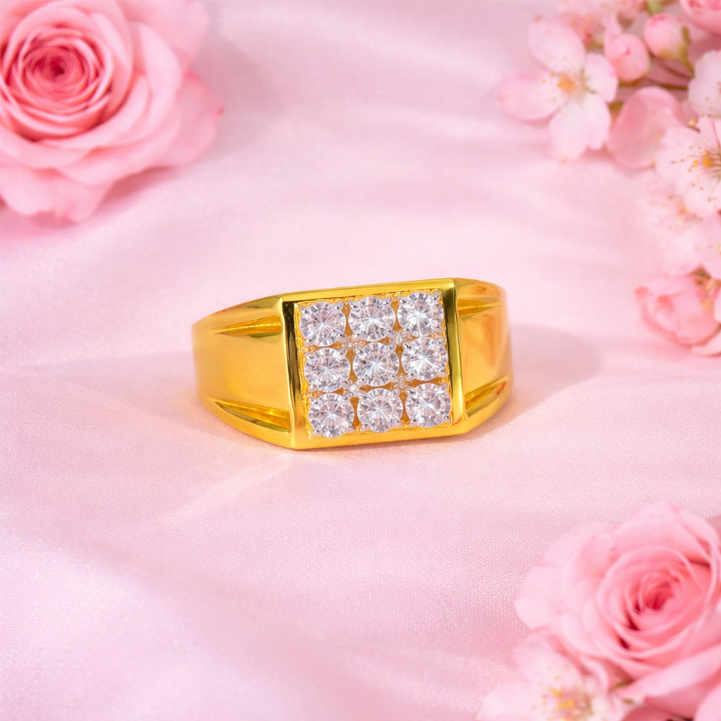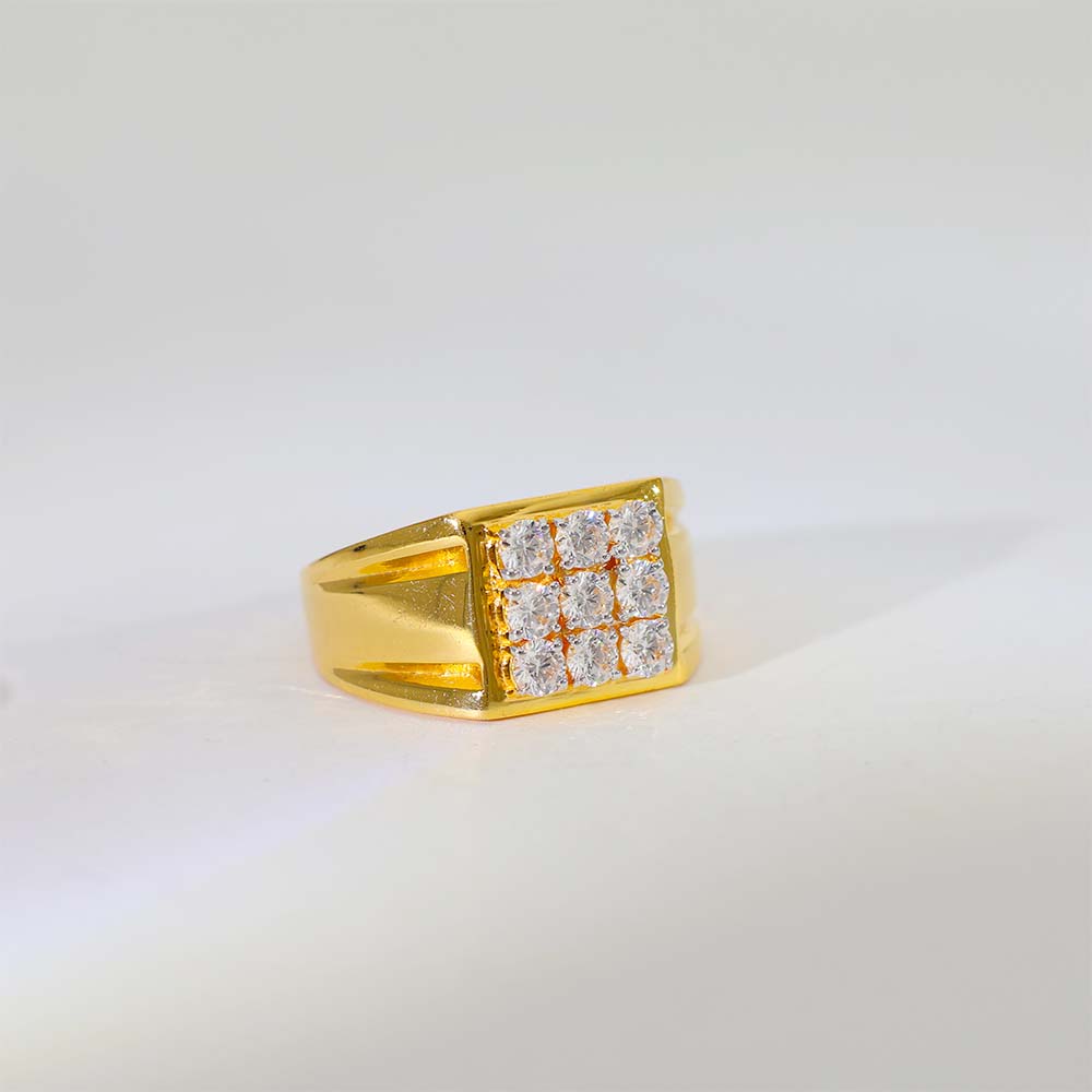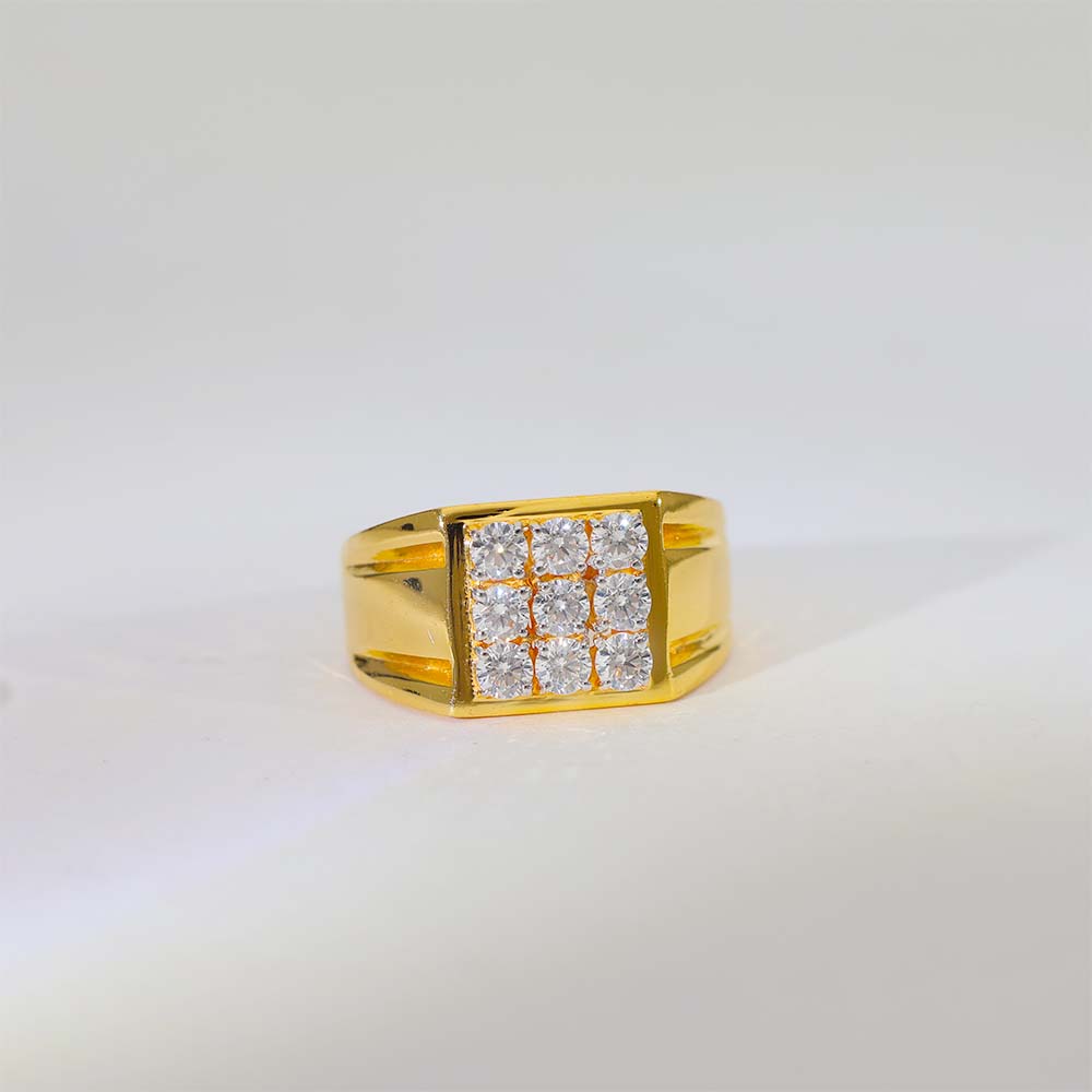 This gents gold ring features a square 9-stone cluster at the center with a smooth gold band for a solid and classy look.