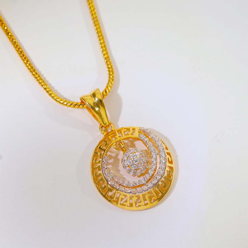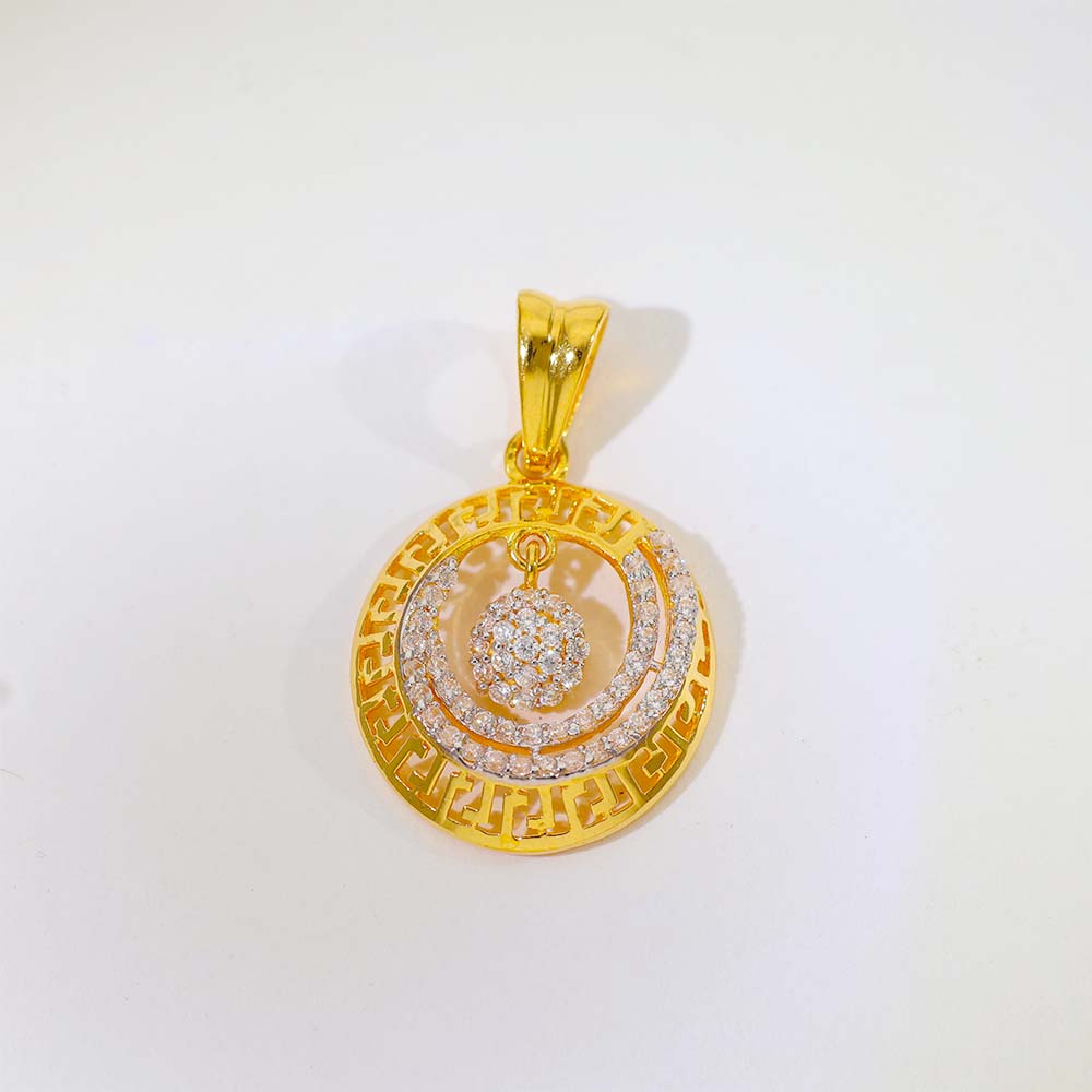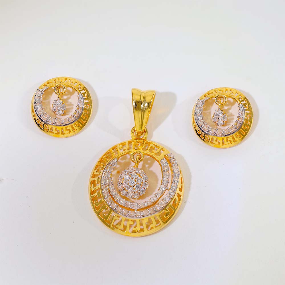 This ladies pendent set features a round layered shape with a stone-lined circle and a hanging stone cluster for added sparkle.