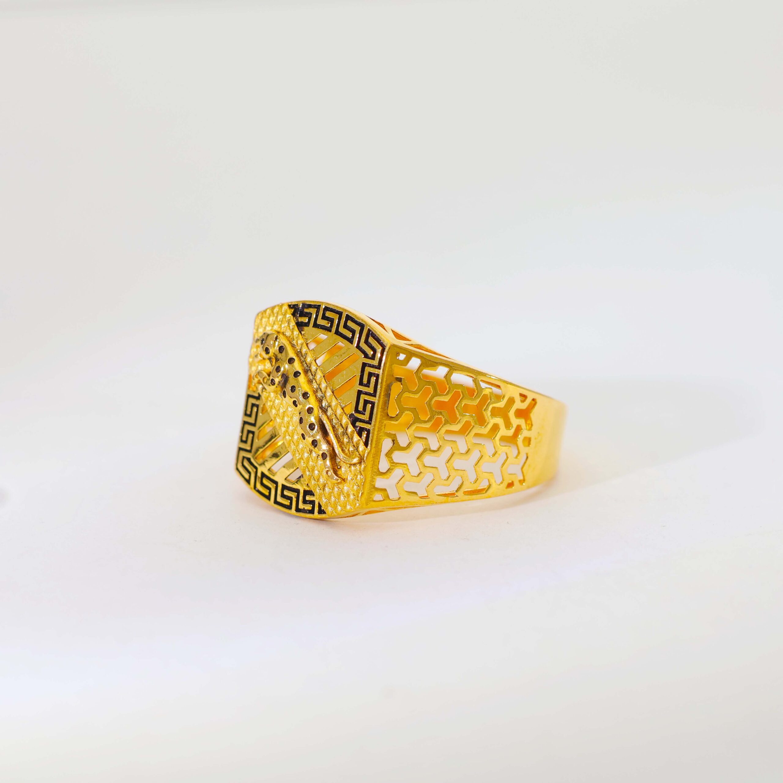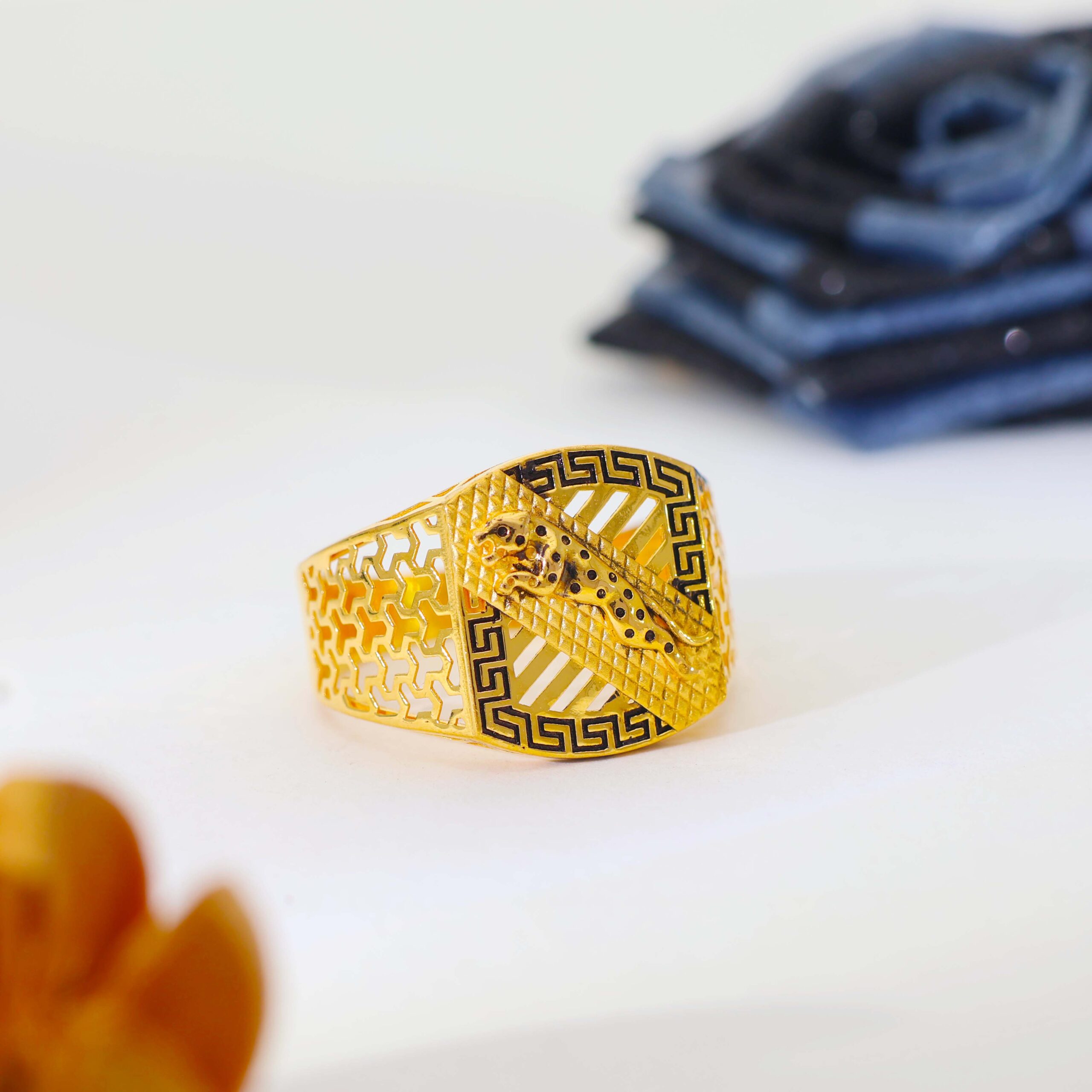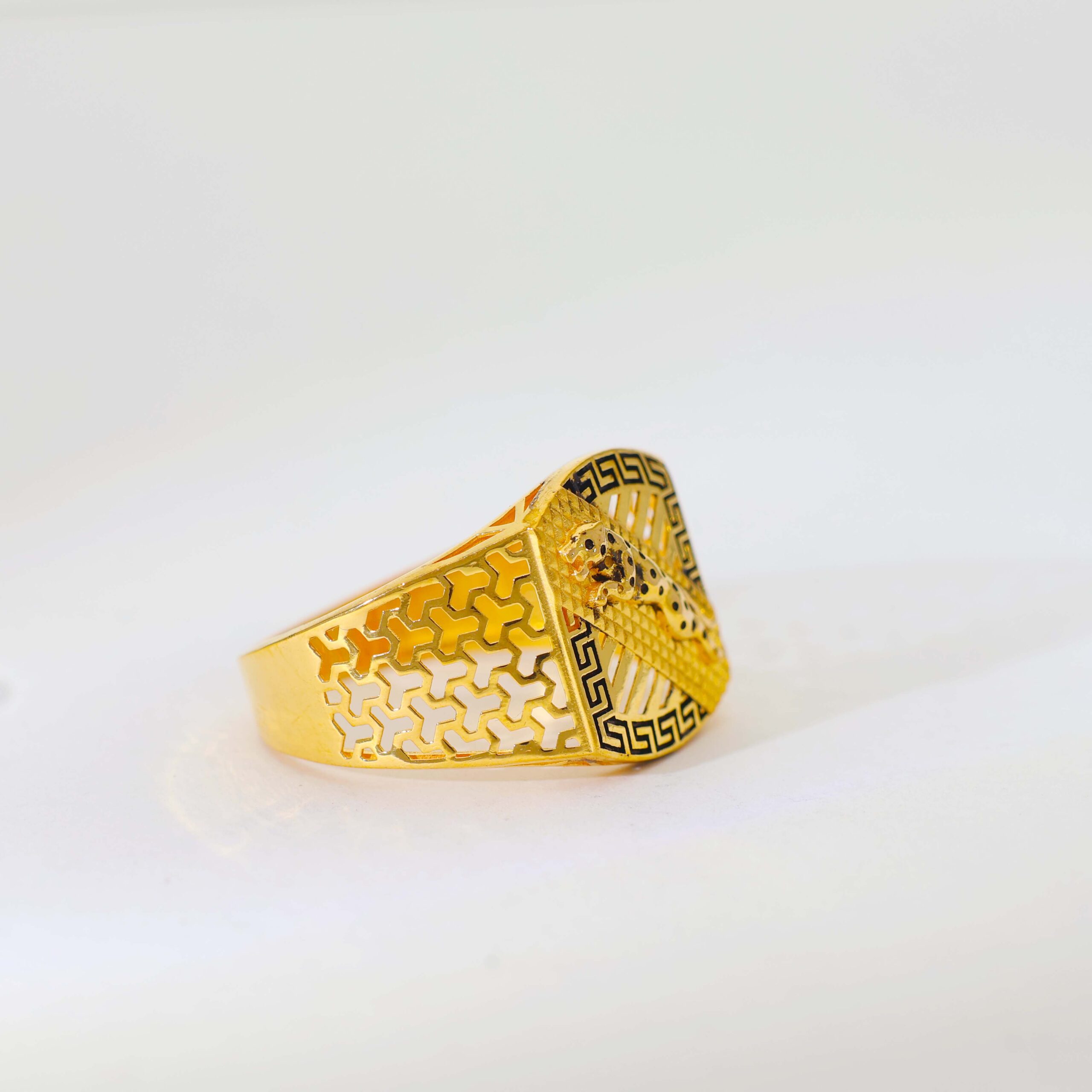 Crafted in premium gold, this gents gold ring features a detailed panther face at the center with black enamel accents and strong geometric side patterns for a royal finish.