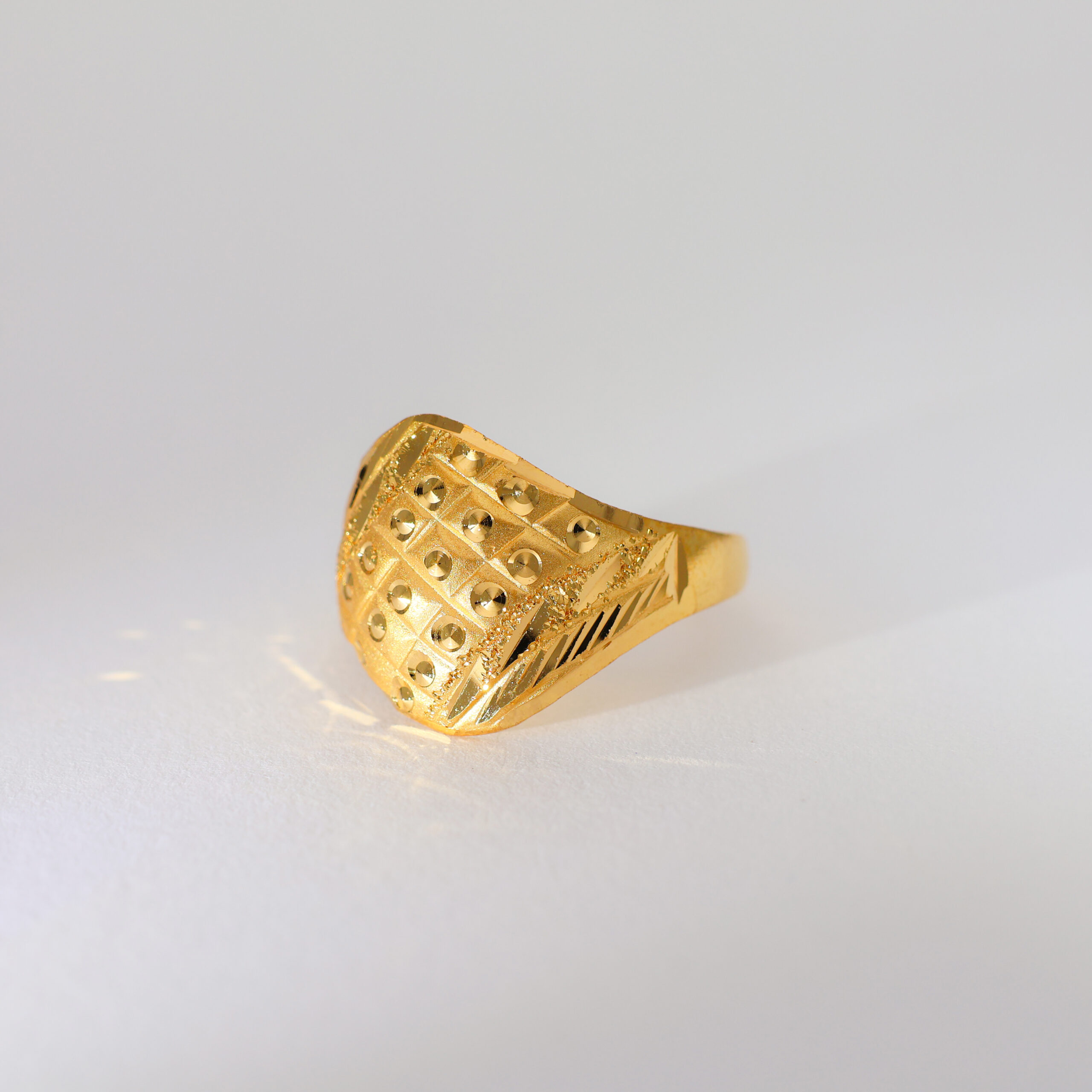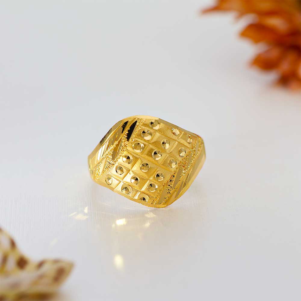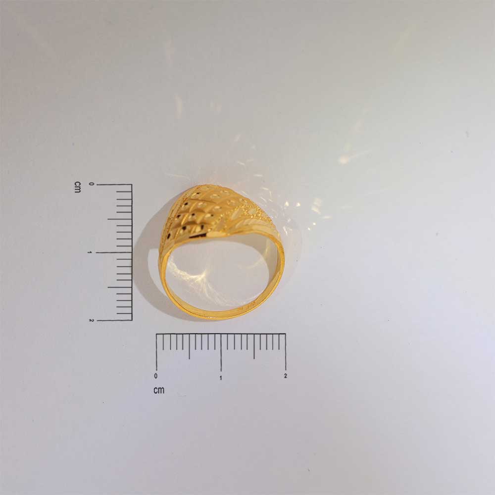 The ring flaunts twisted textured grooves in bright yellow gold, giving it a dynamic, regal twist with a bold gold dome.
