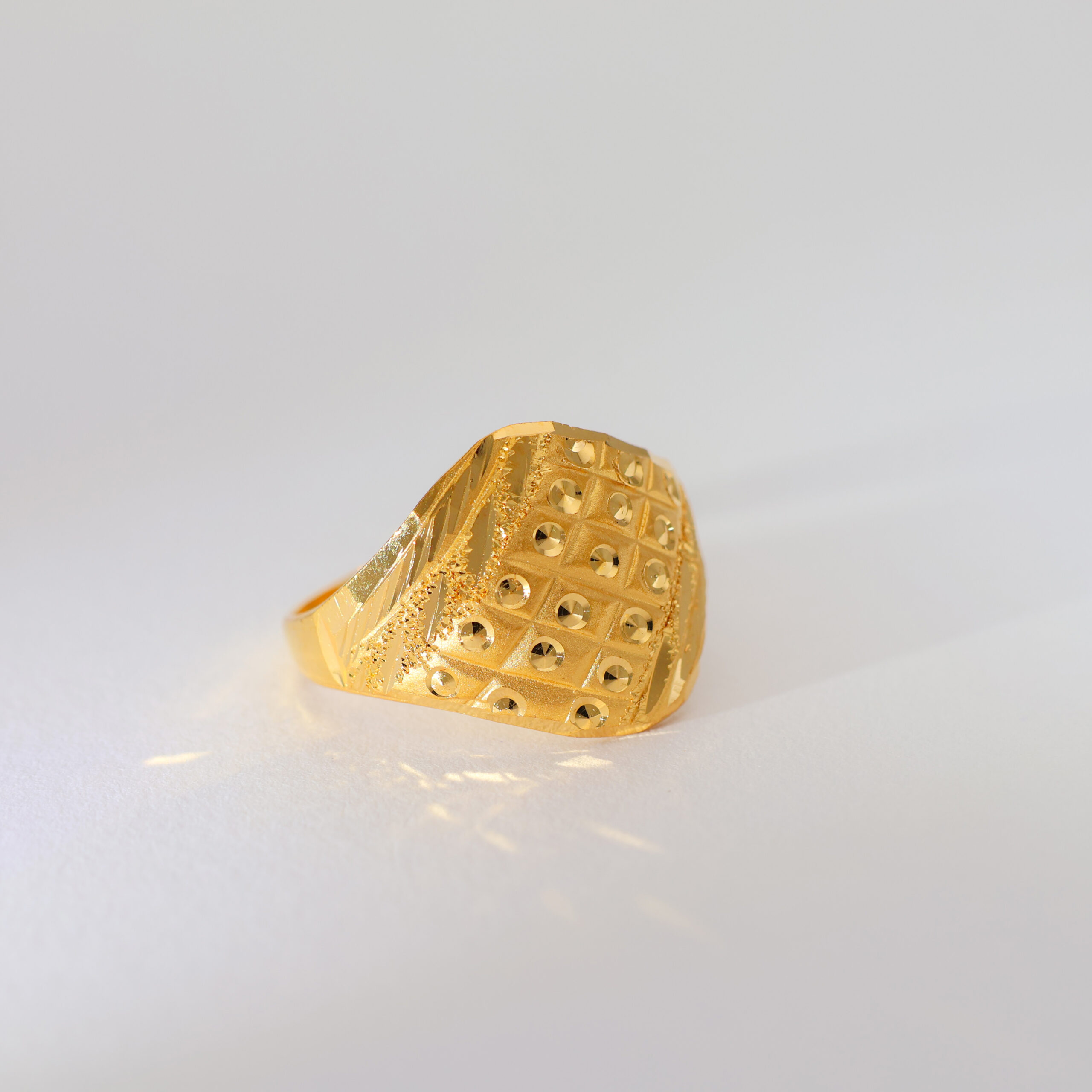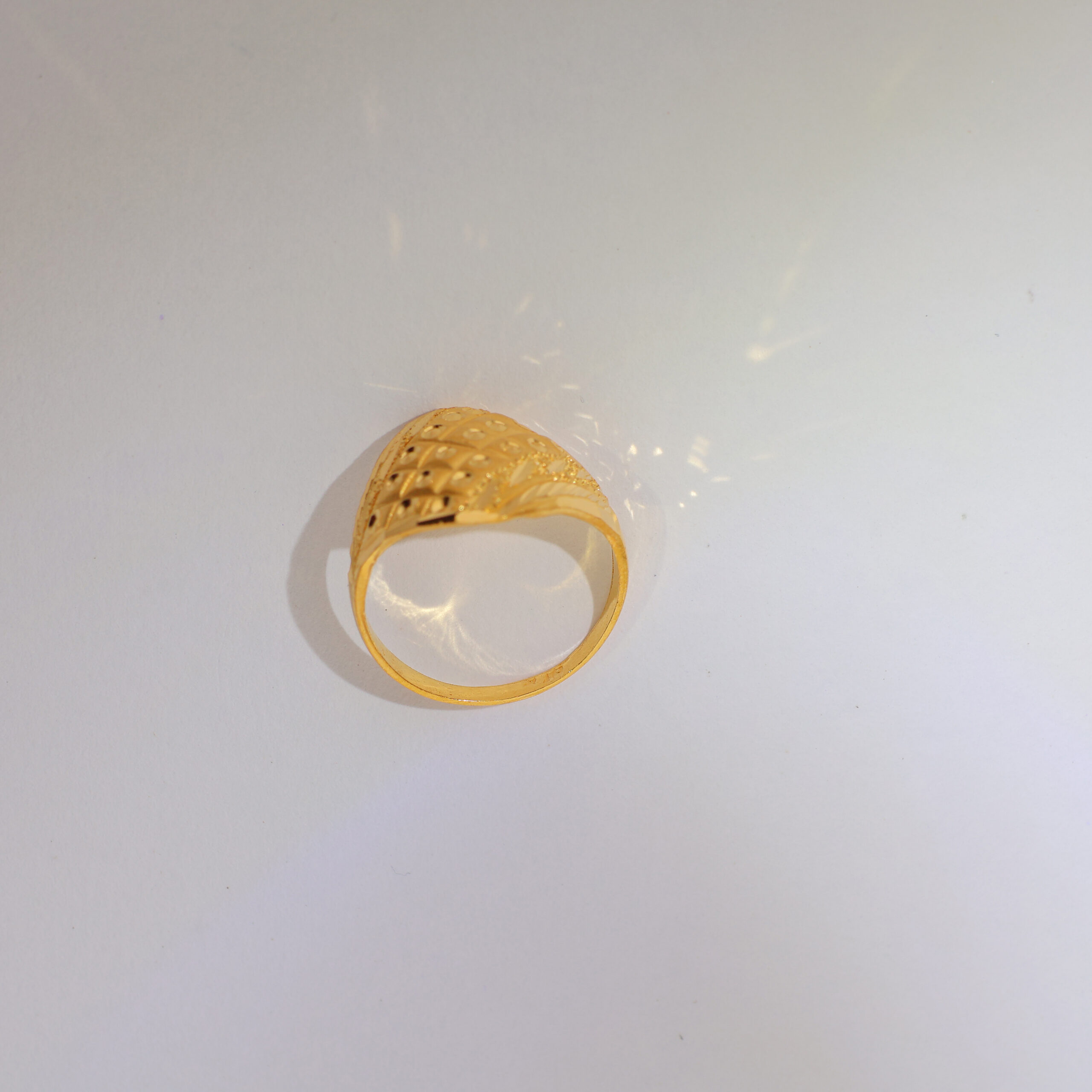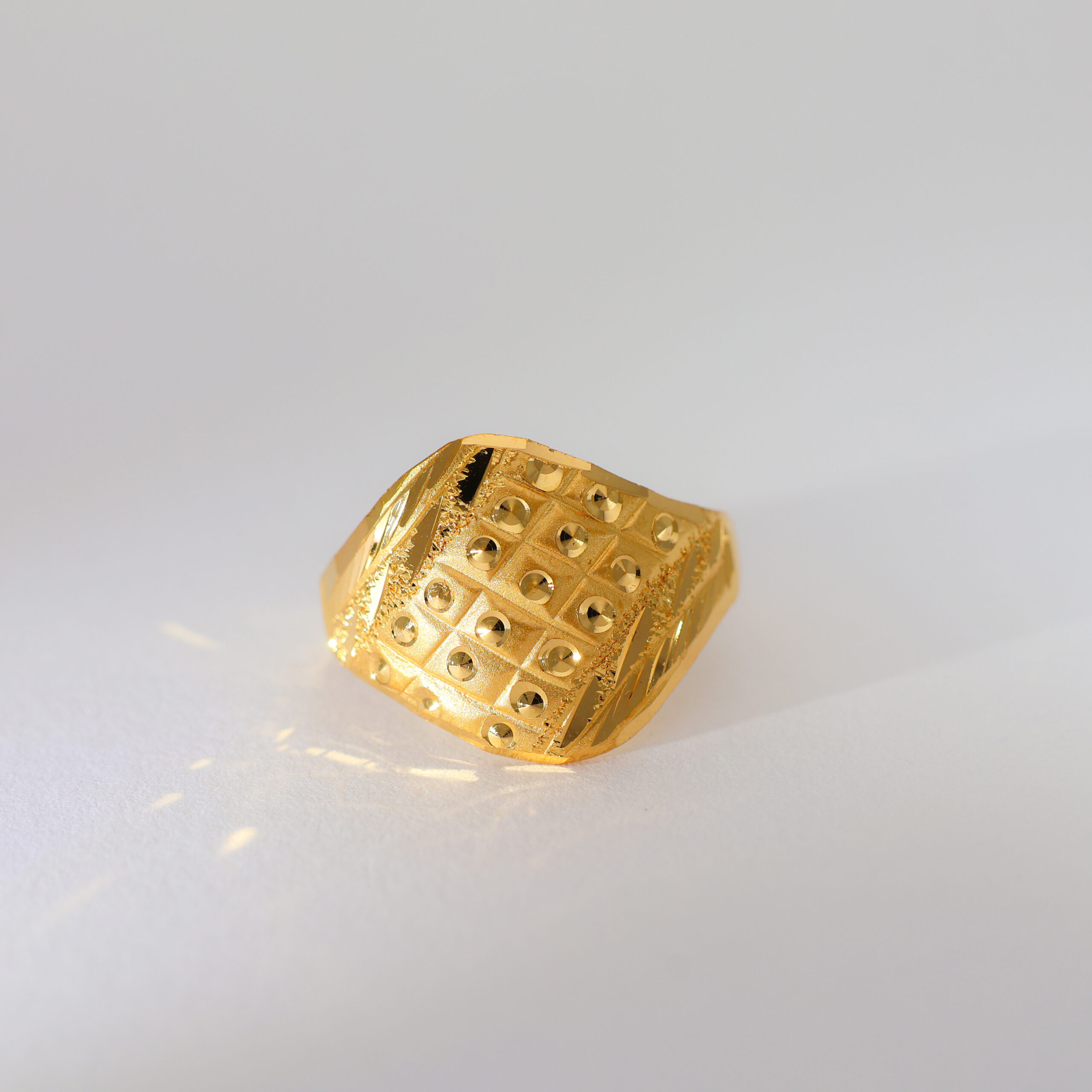 The ring flaunts twisted textured grooves in bright yellow gold, giving it a dynamic, regal twist with a bold gold dome.
