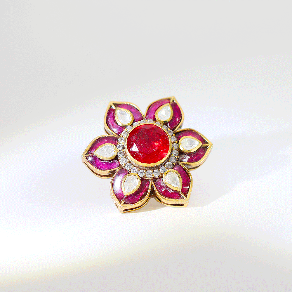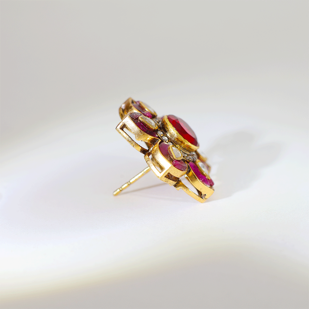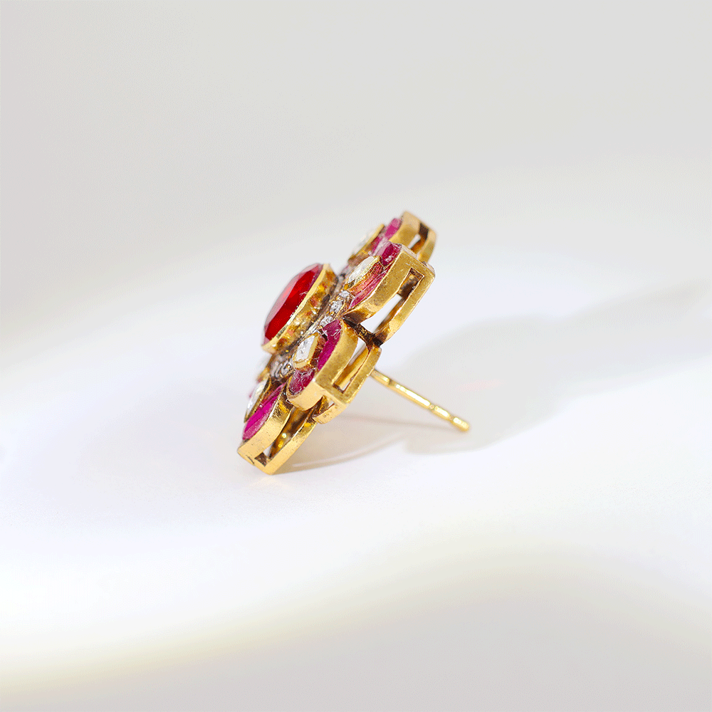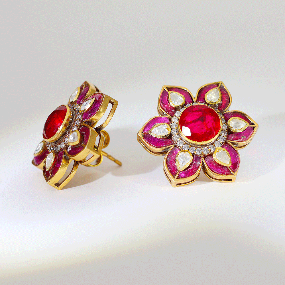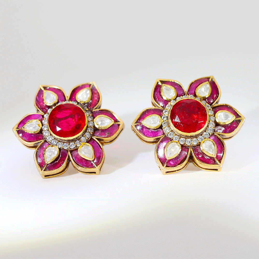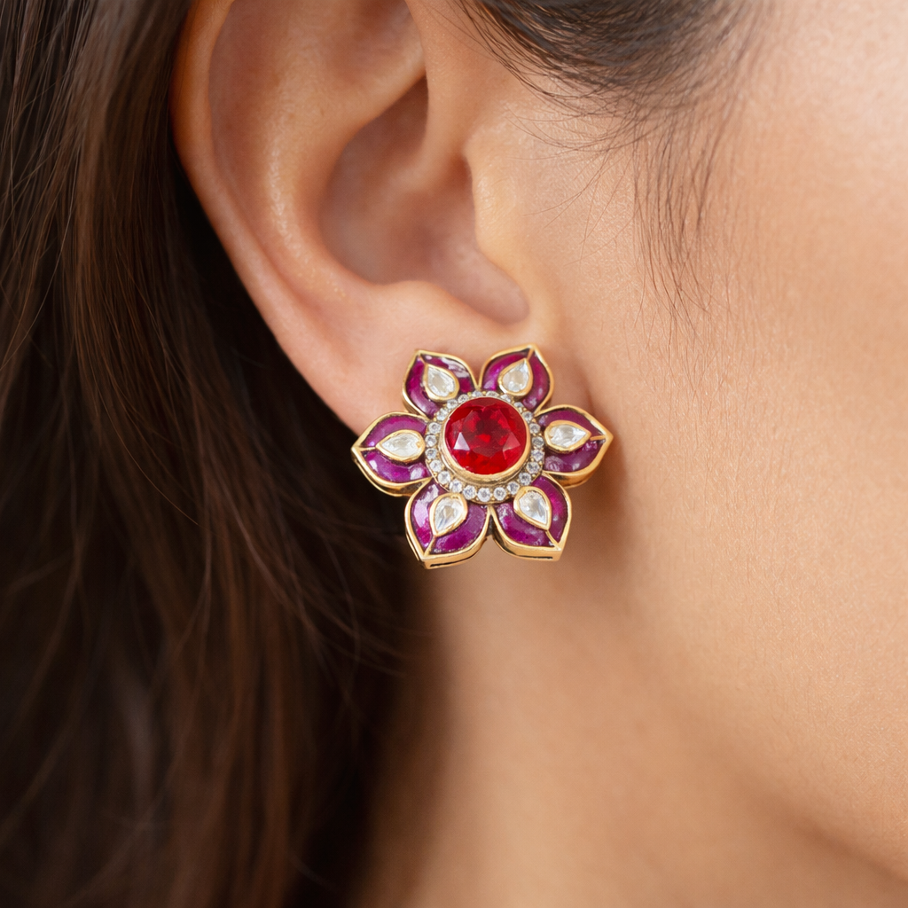 A stunning pair of floral stud earrings crafted with a rich ruby center, surrounded by delicate pink enamel petals and sparkling kundan-style stones. Finished in a warm gold tone, these earrings bring together traditional charm and vibrant elegance—perfect for festive and special occasions.