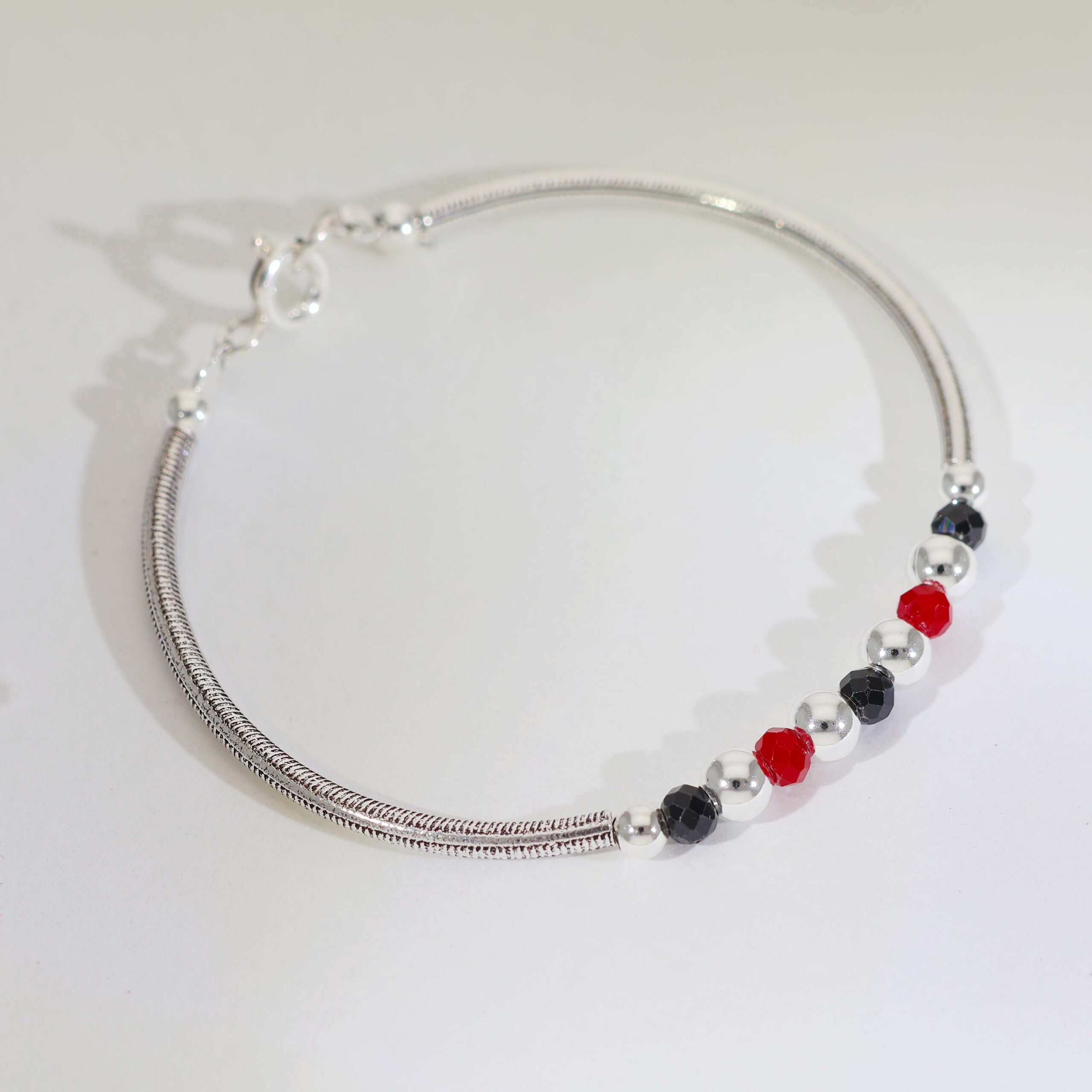 A polished 92.5 silver bracelet featuring alternating red and black faceted beads with smooth silver beads that create a balanced and elegant baby jewelry style.