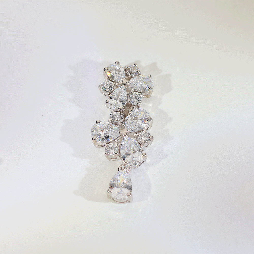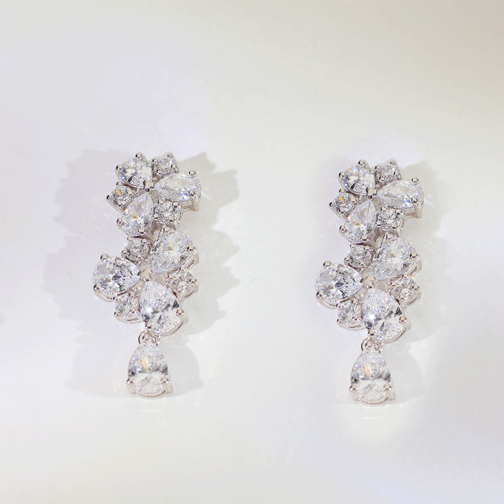 A cluster of round and pear-cut stones forming a flower-like pattern with a gentle drop.