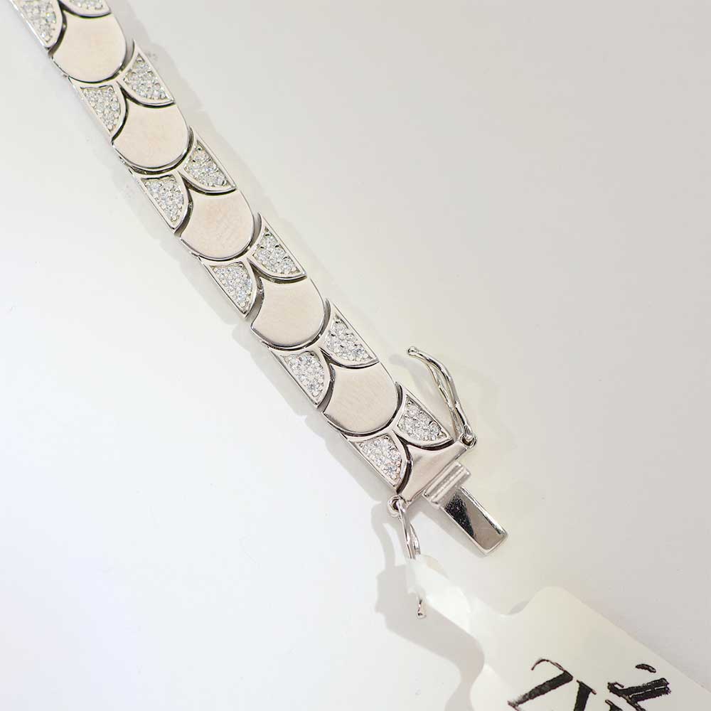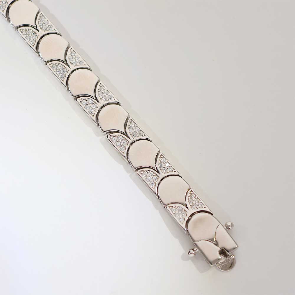 A regal 925 silver bracelet in a rhodium finish, featuring domed links paired with CZ pavé accents that resemble a crown-scale pattern.