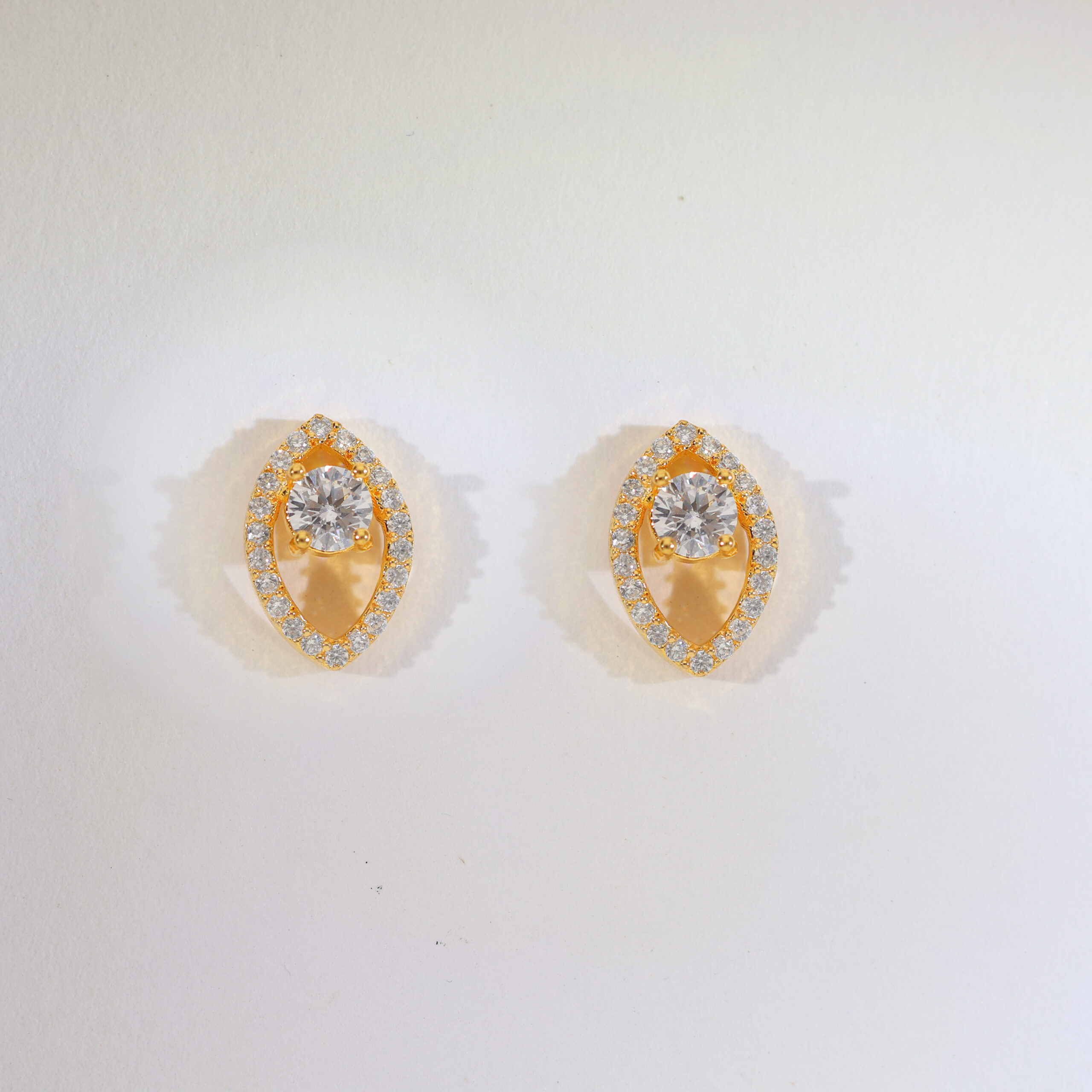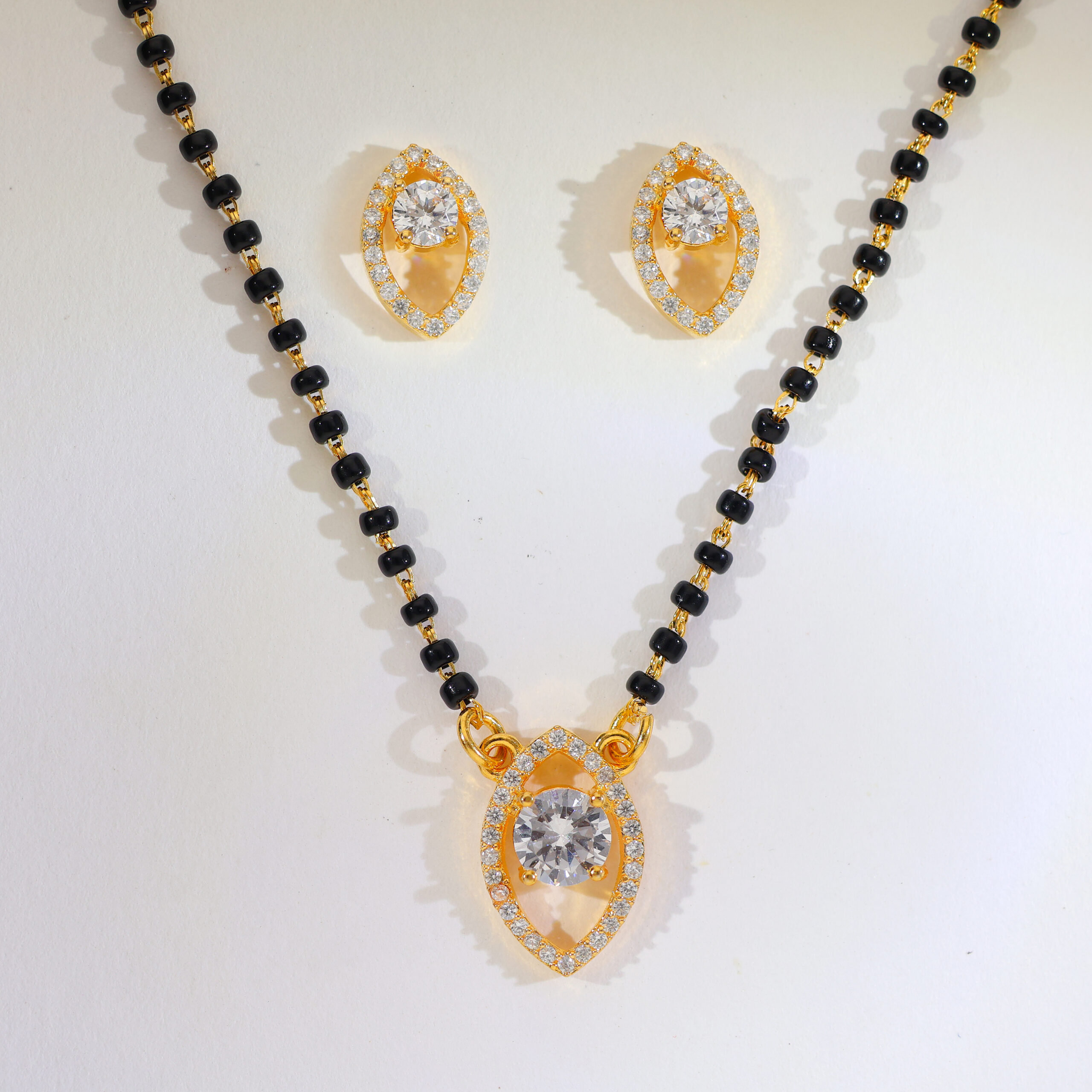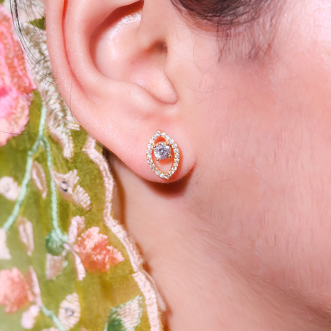 Design: A smooth leaf frame sparkles with tiny CZs around a single bright round stone; paired with leaf-style studs and a single-line bead chain.