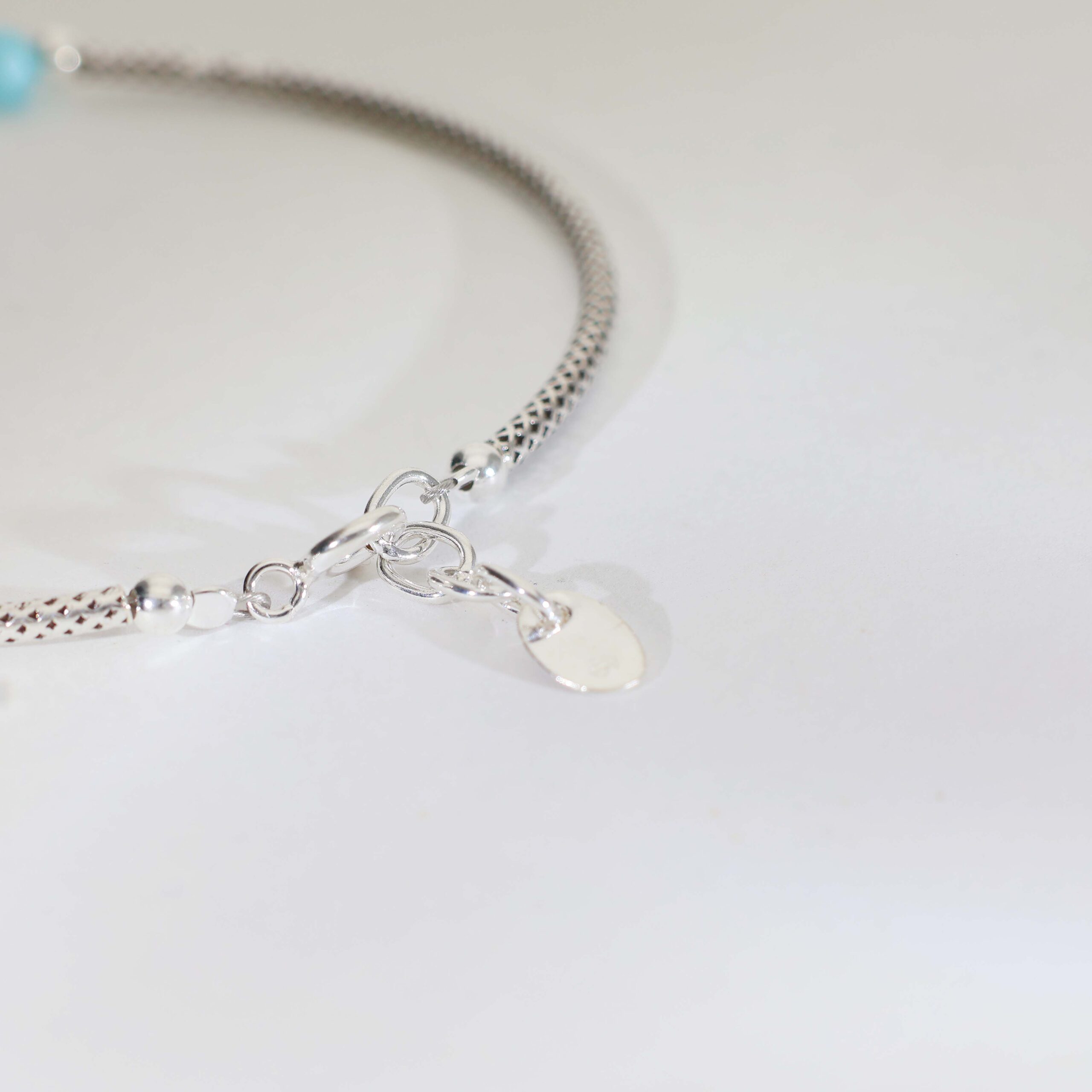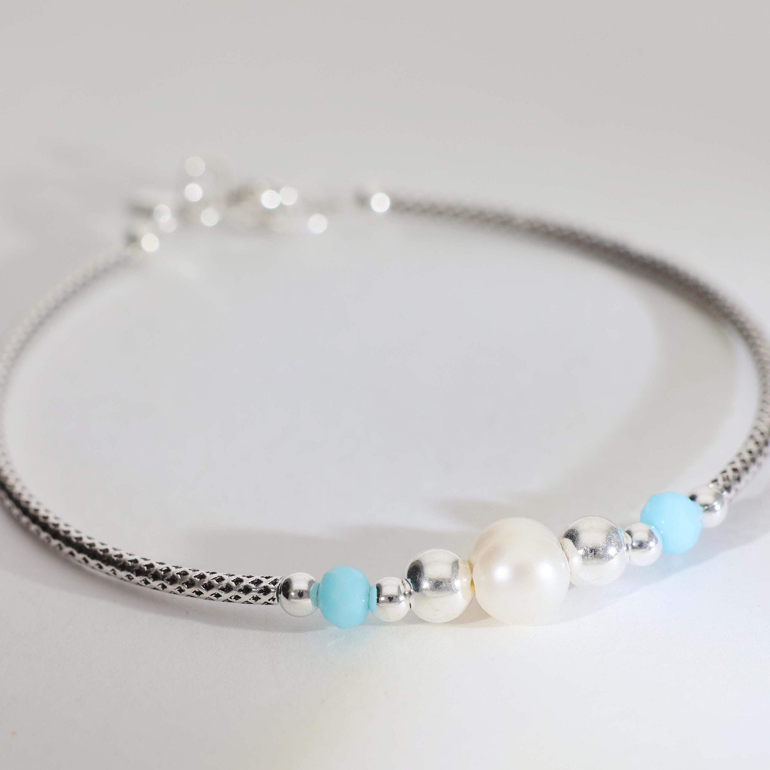 A polished 92.5 silver textured chain featuring a pearl centerpiece, sky-blue beads, and polished silver accents for a soft and elegant baby bracelet look.