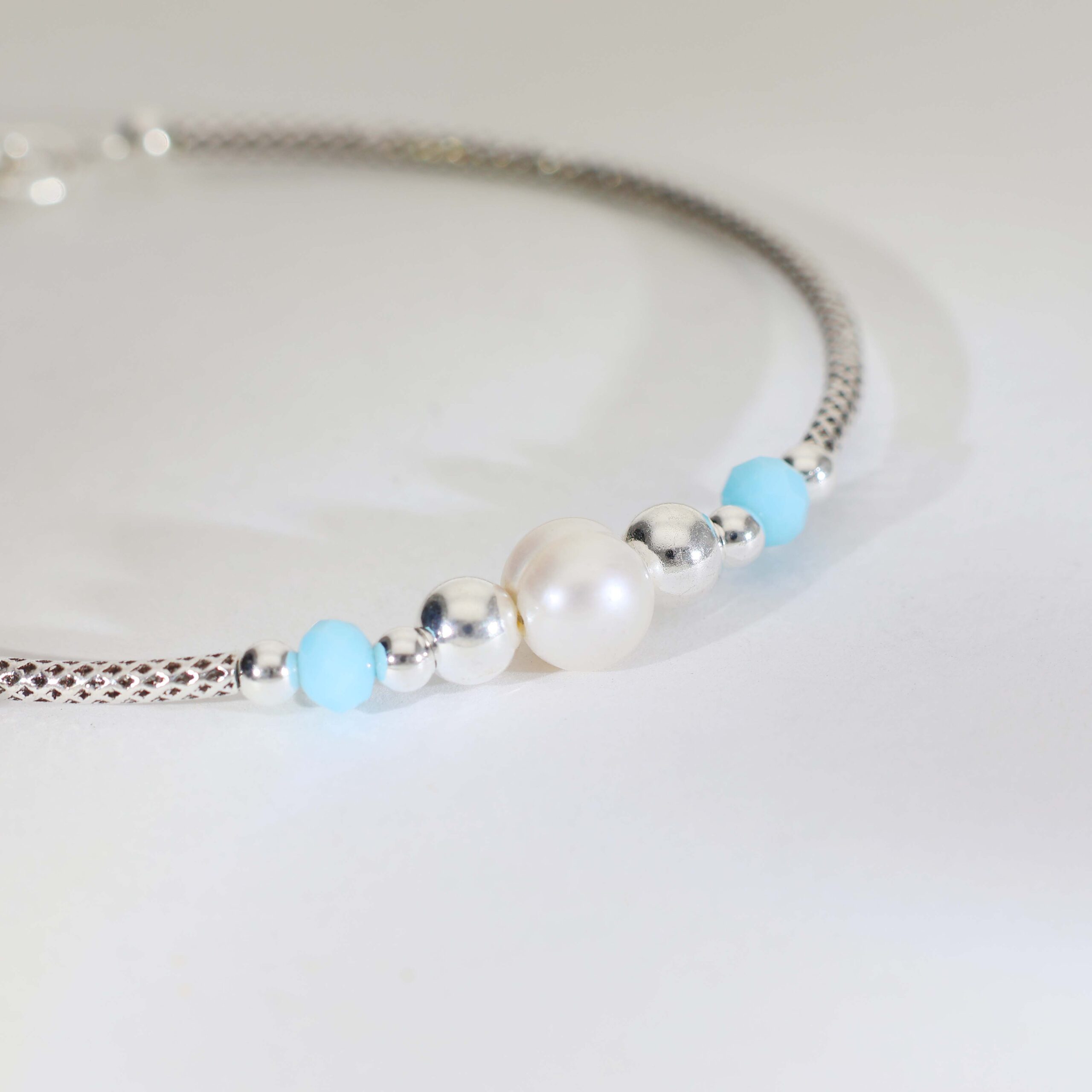 ✔ Pearl centerpiece + sky-blue beads + silver accents