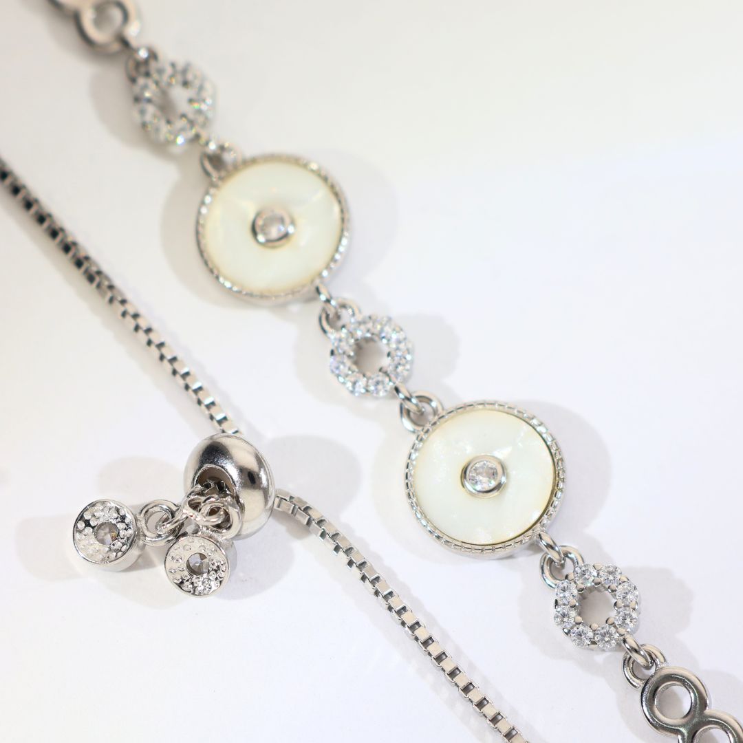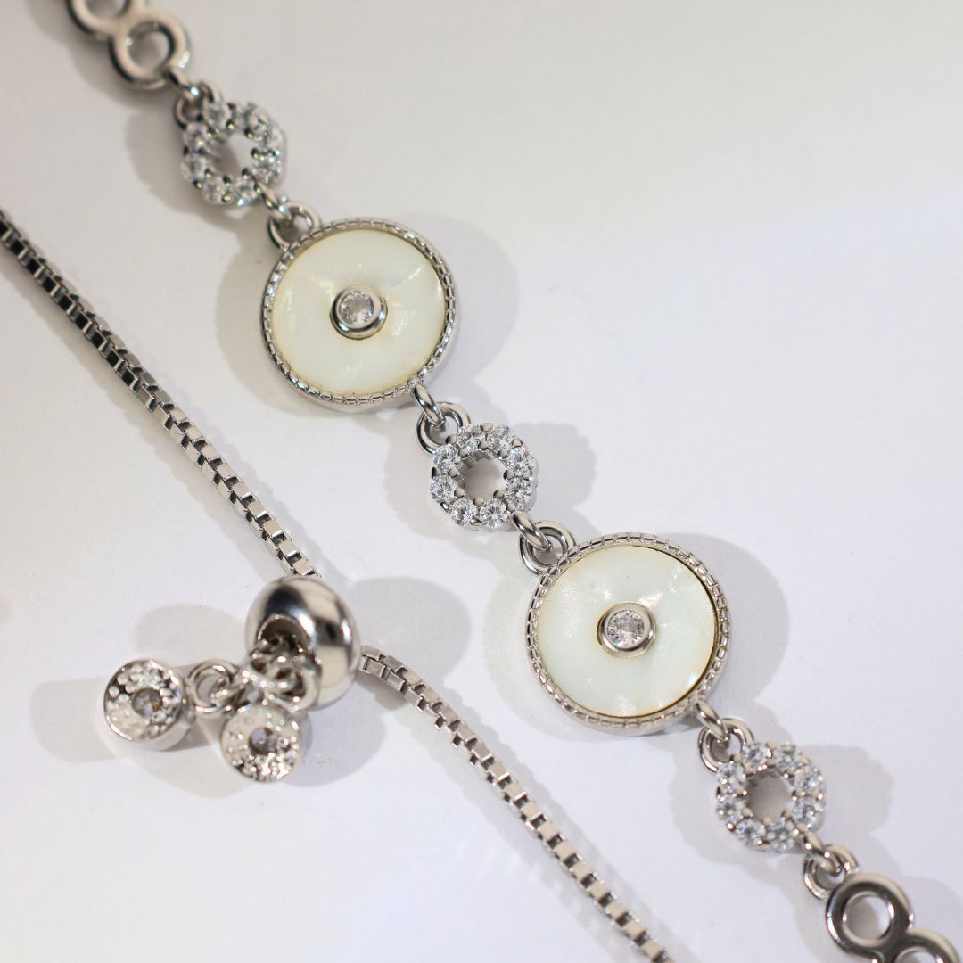 Designed with smooth white round motifs, crystal circle links, and a polished adjustable silver chain.