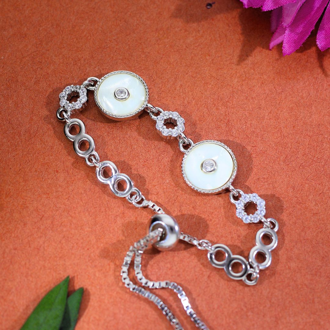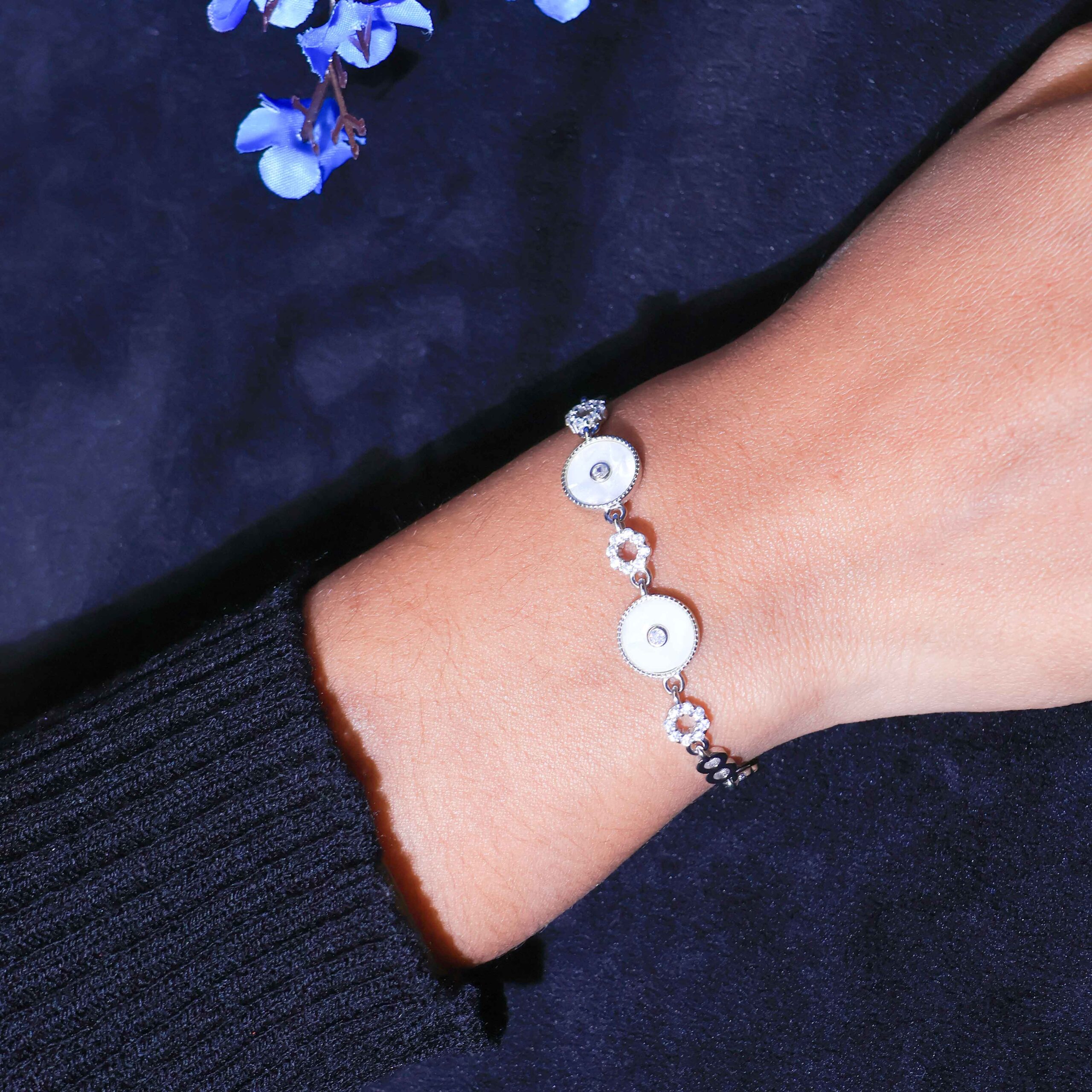 A soft and elegant silver girlish bracelet with a clean white look and subtle sparkle.
