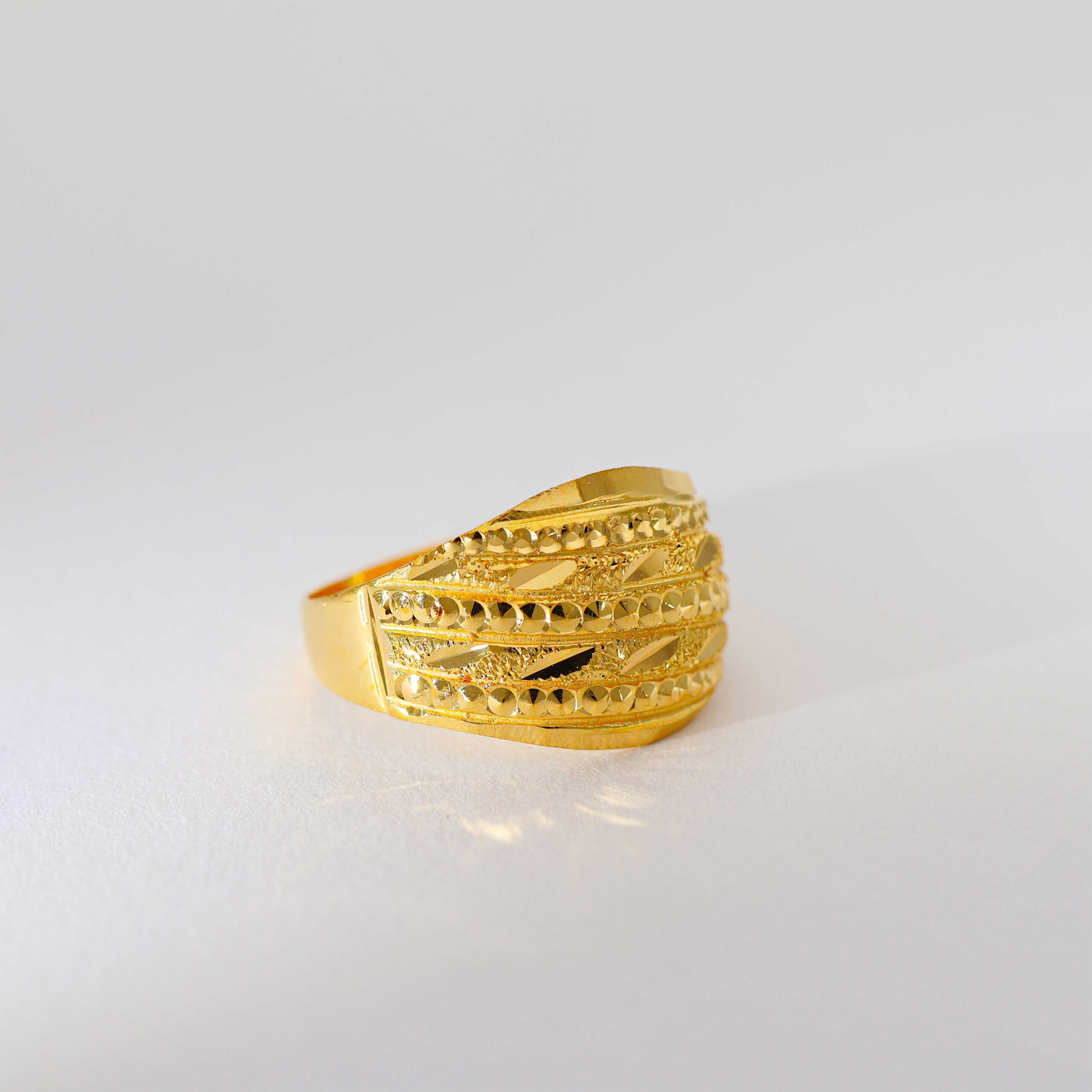 Design: This wide ring features finely cut lines, polished gold beads, and soft curved shaping for a graceful touch.