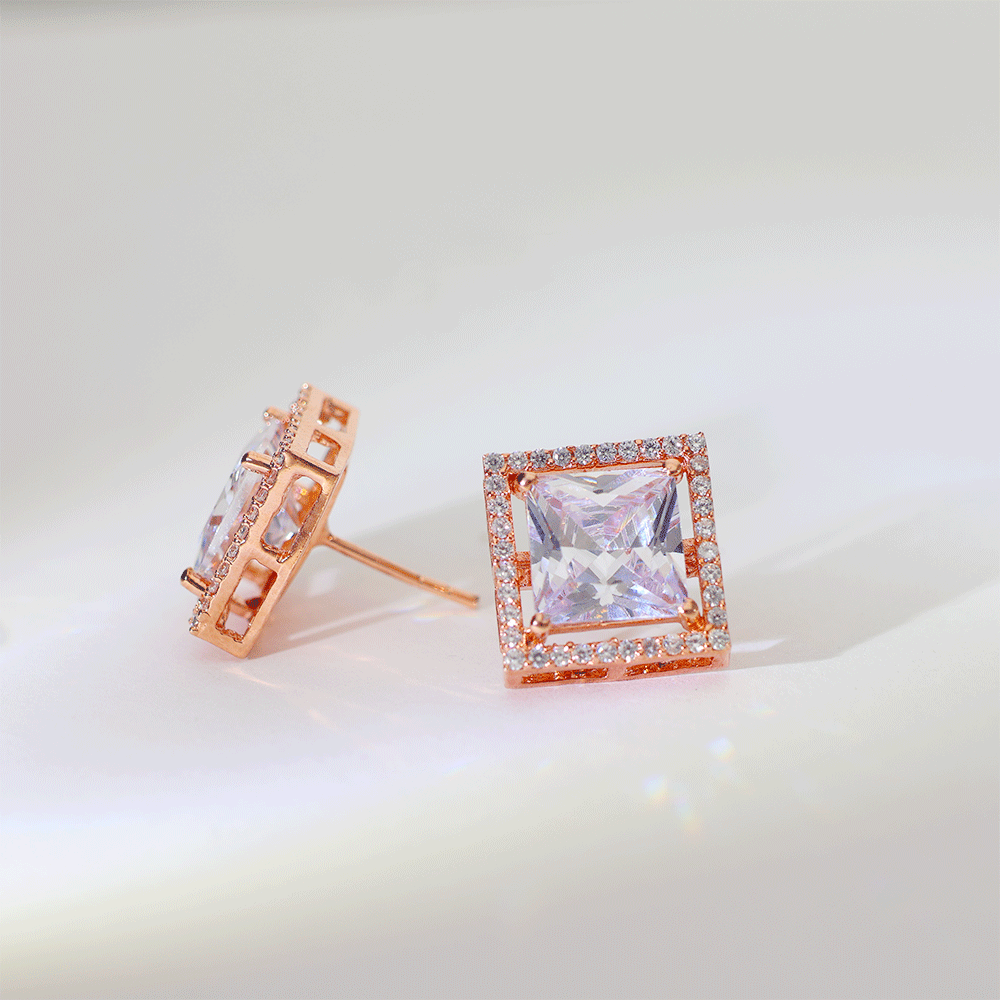 Design: Crafted with a square-cut crystal at the center, surrounded by a halo of small stones with a detailed side frame for extra shine.
