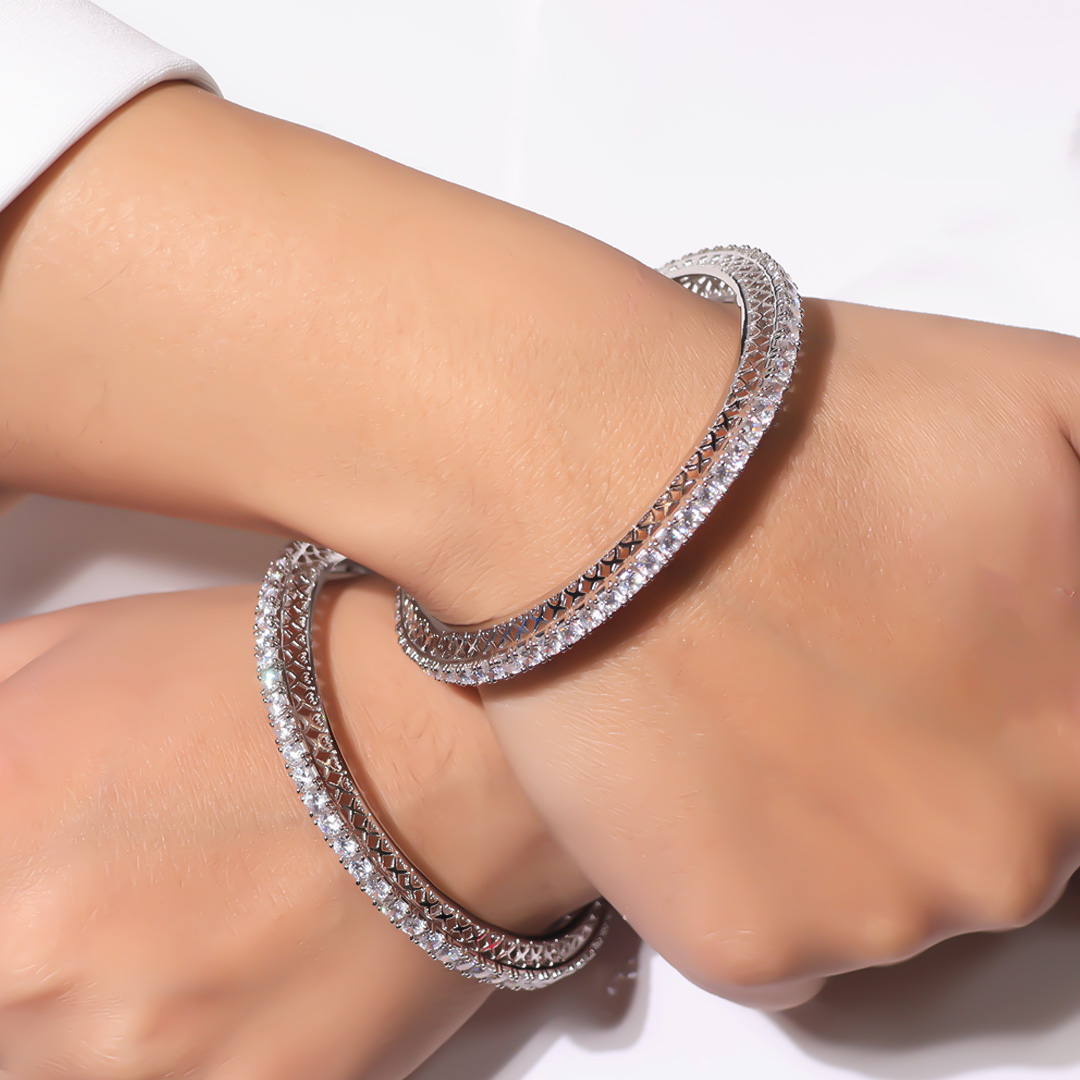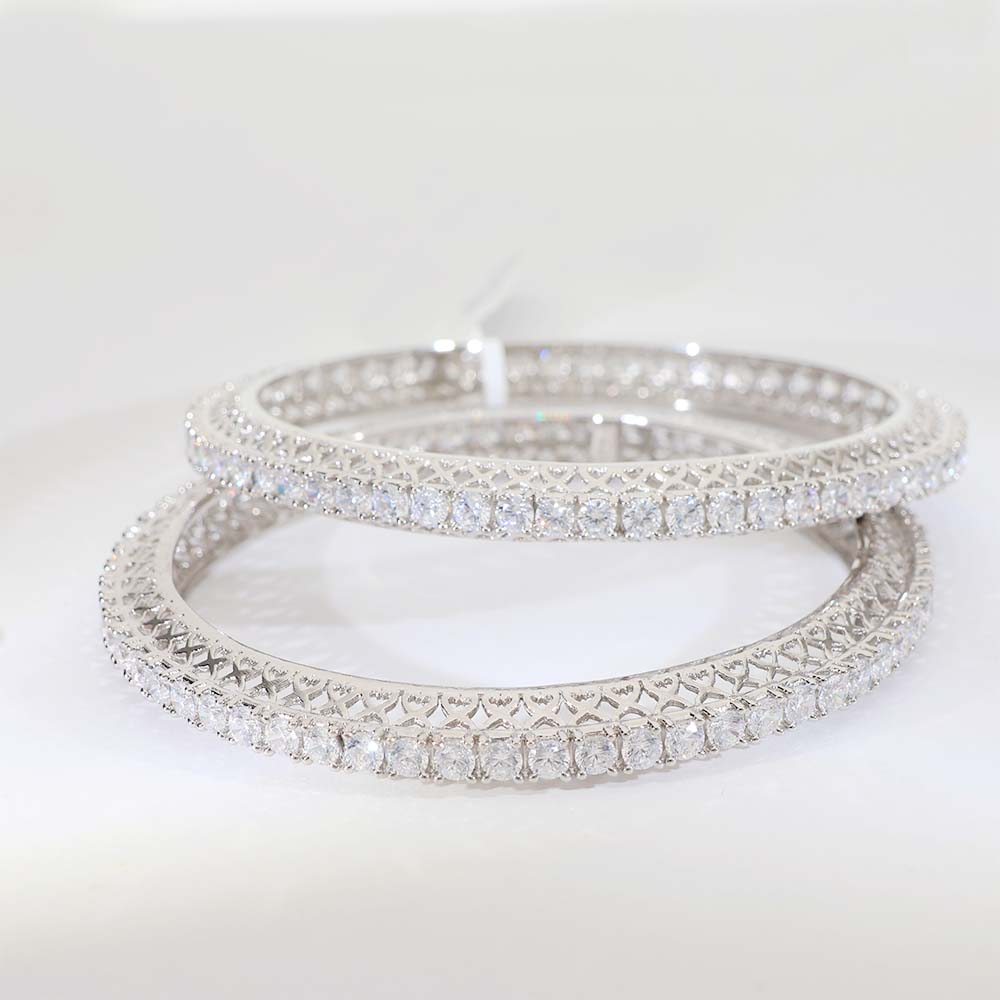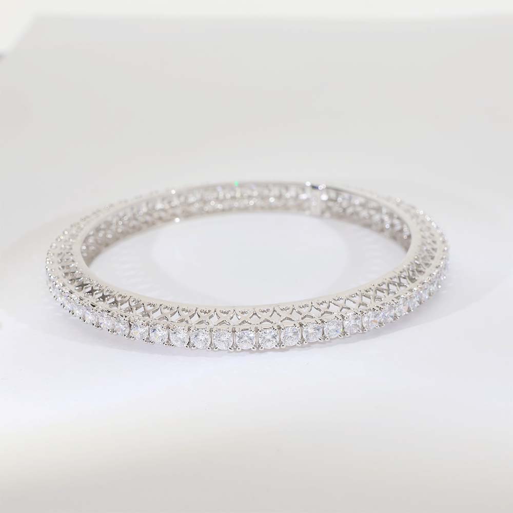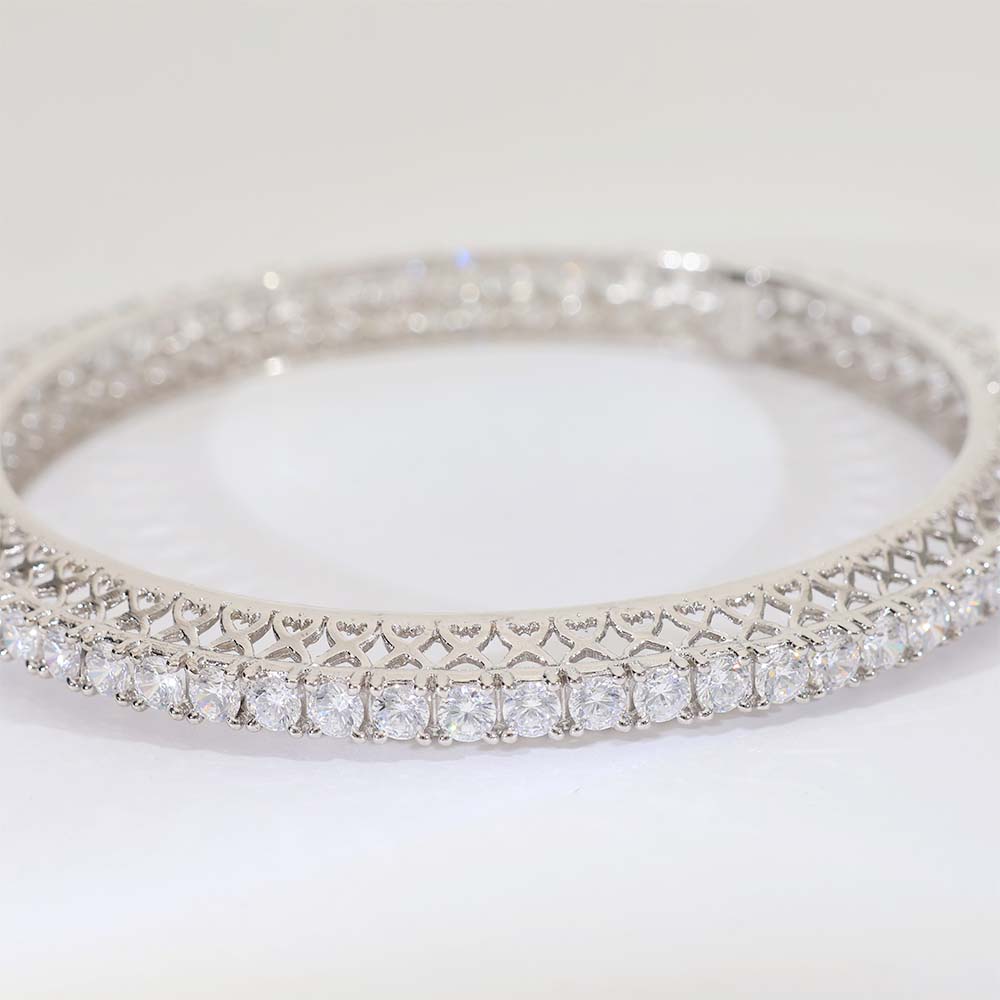 Design: Each bangle is crafted in 92.5 sterling silver with a slim, strong frame. Round clear stones are prong-set in a continuous line, supported by a patterned under-gallery that adds a touch of designer detail without adding weight.