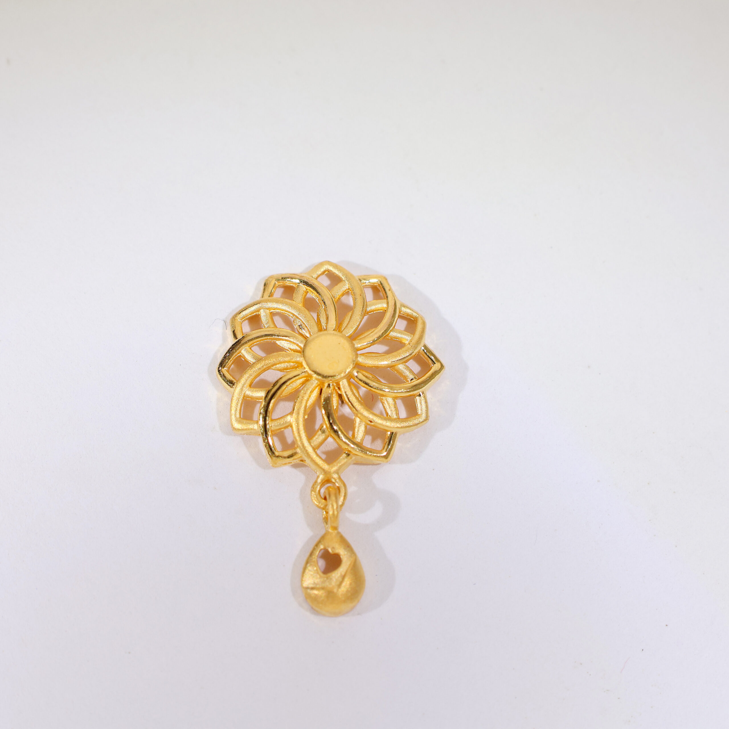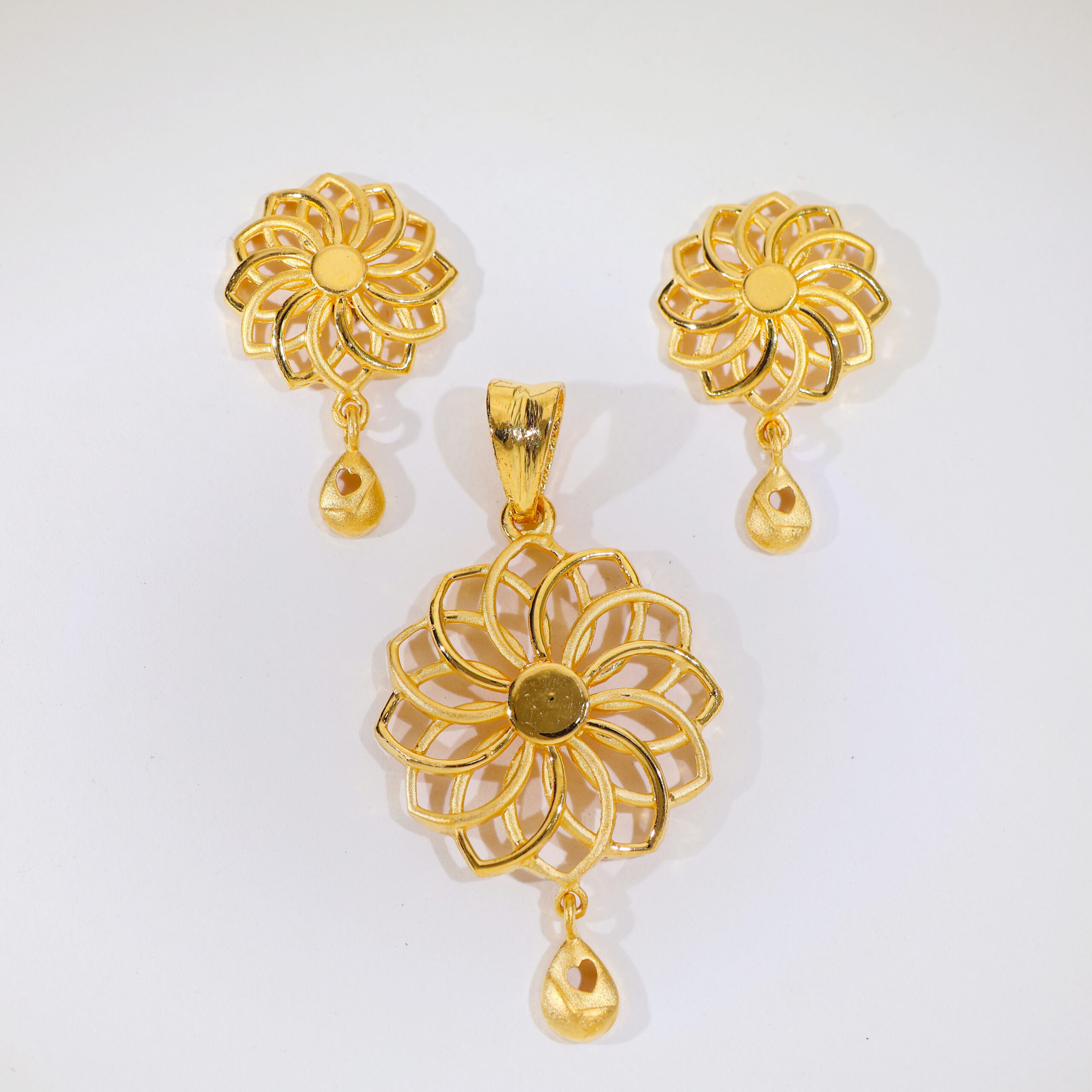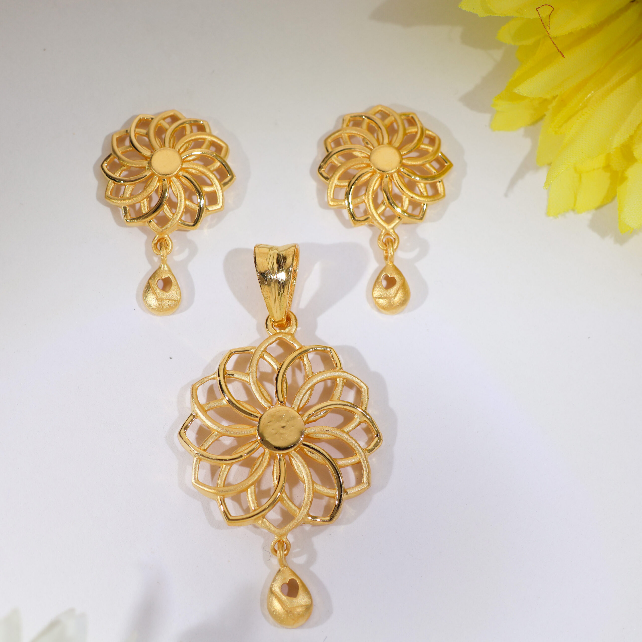 Design: Open-work flower with soft spiral petals and a smooth round center, finished with a teardrop dangler. Matching earrings mirror the same swirl for a neat, balanced look.