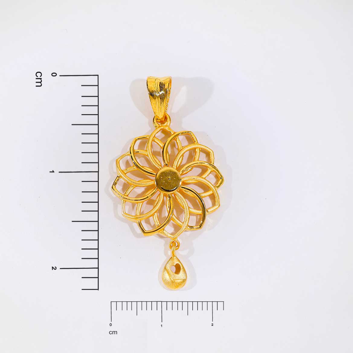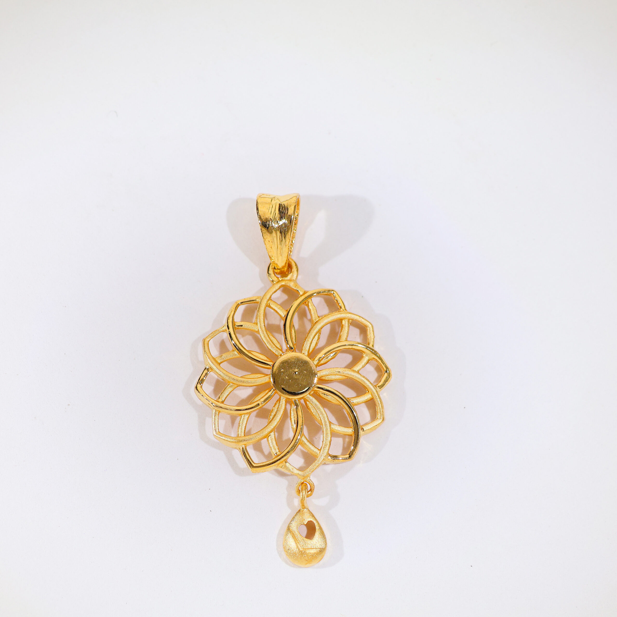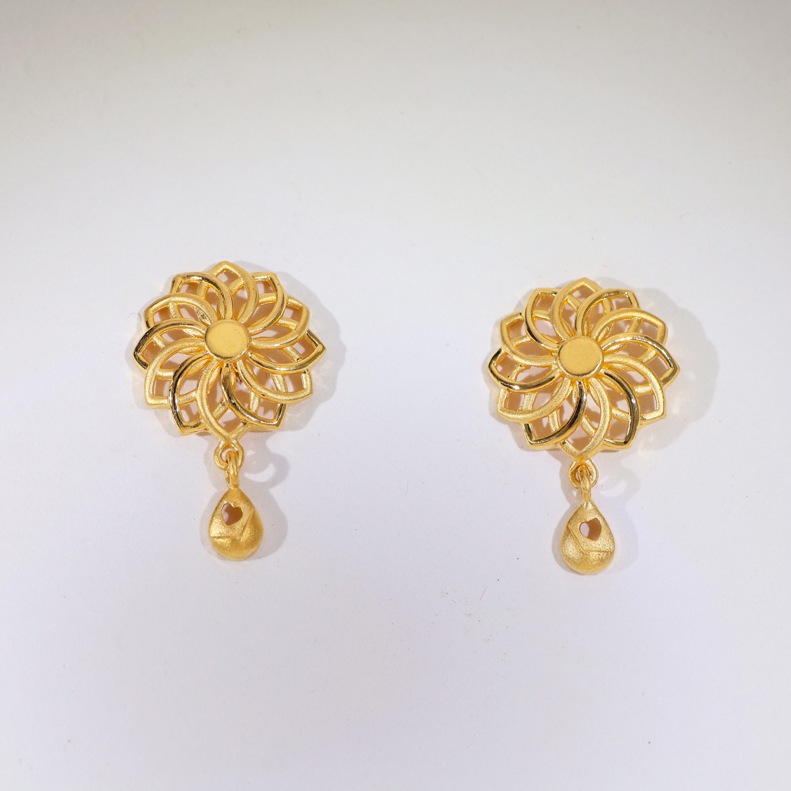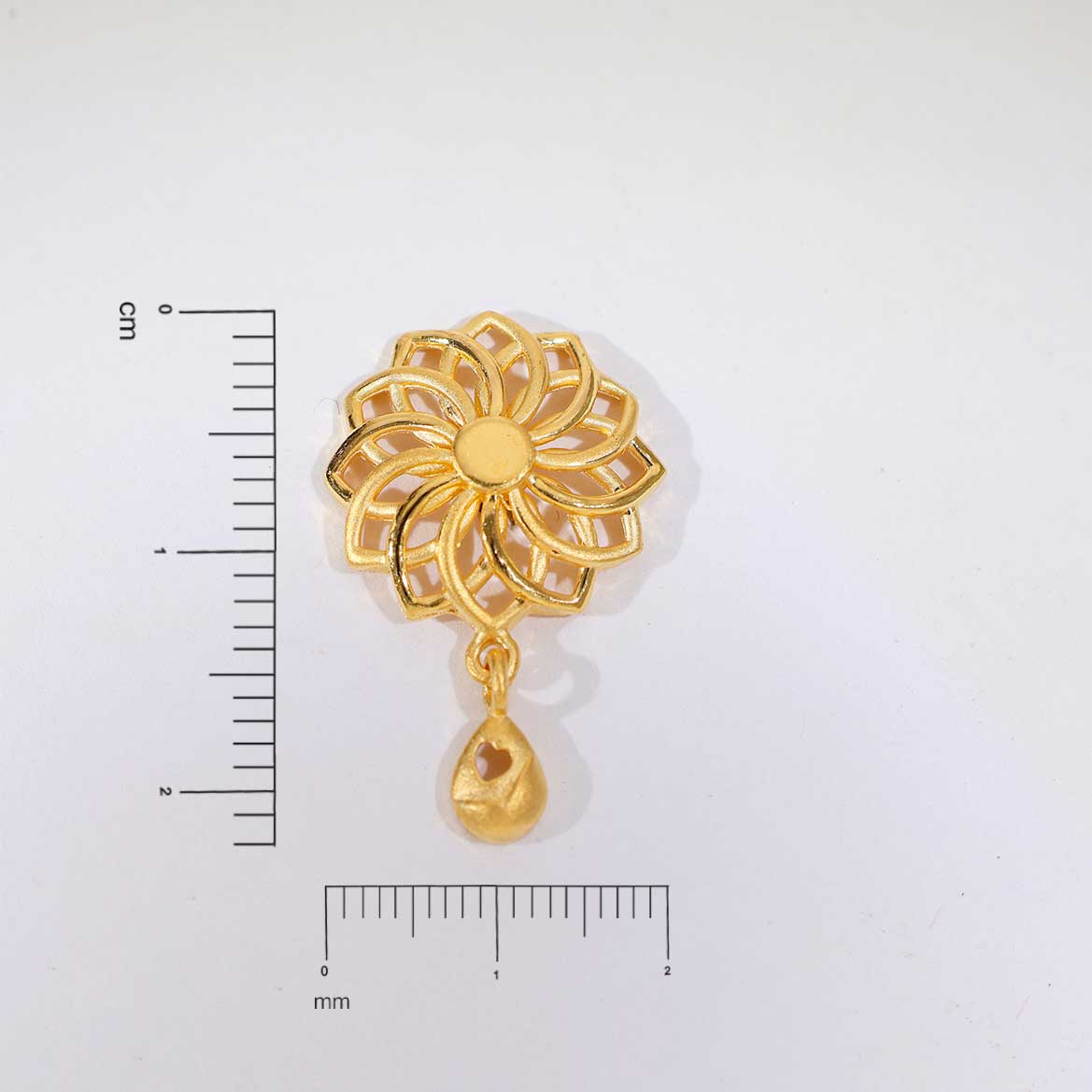 Design: Open-work flower with soft spiral petals and a smooth round center, finished with a teardrop dangler. Matching earrings mirror the same swirl for a neat, balanced look.