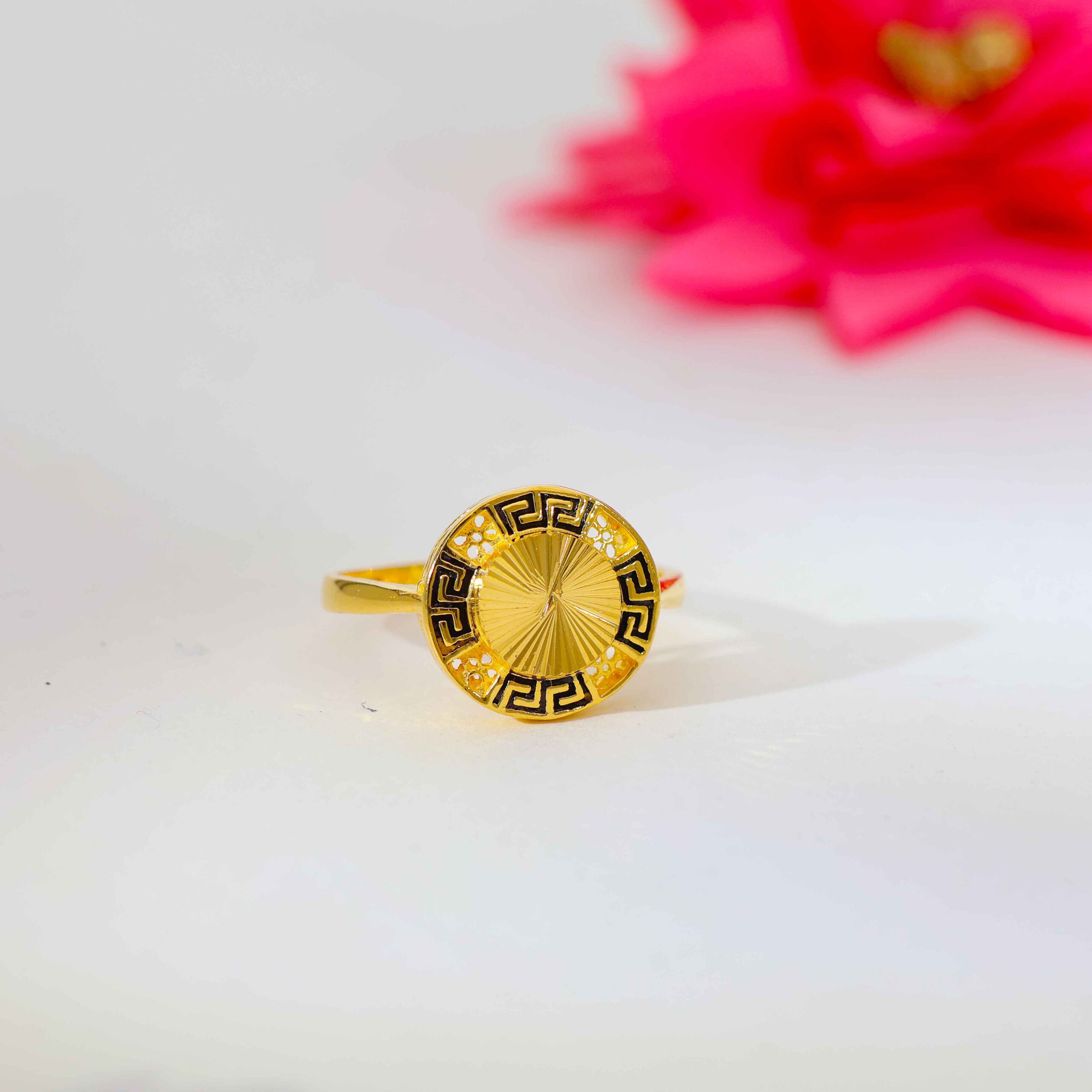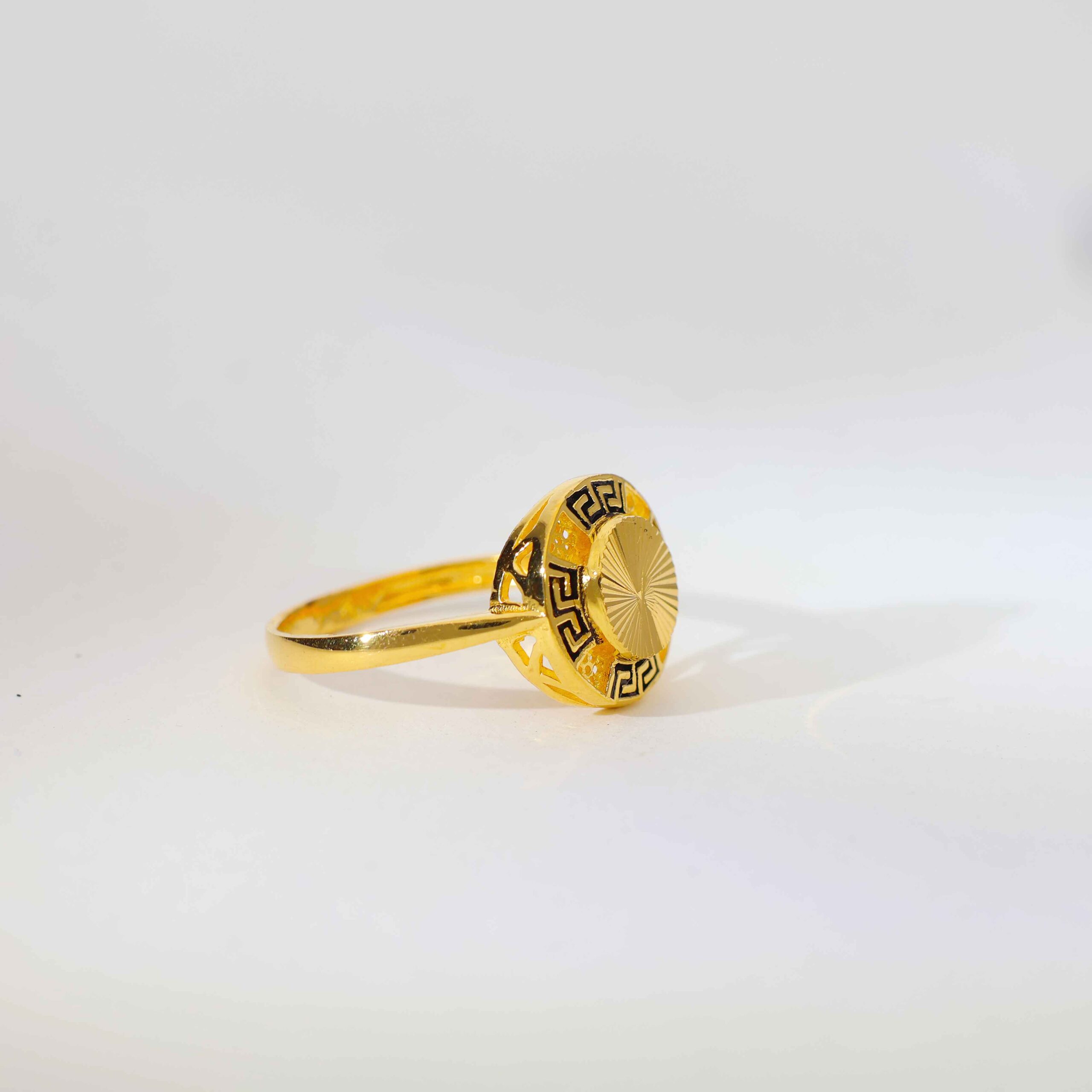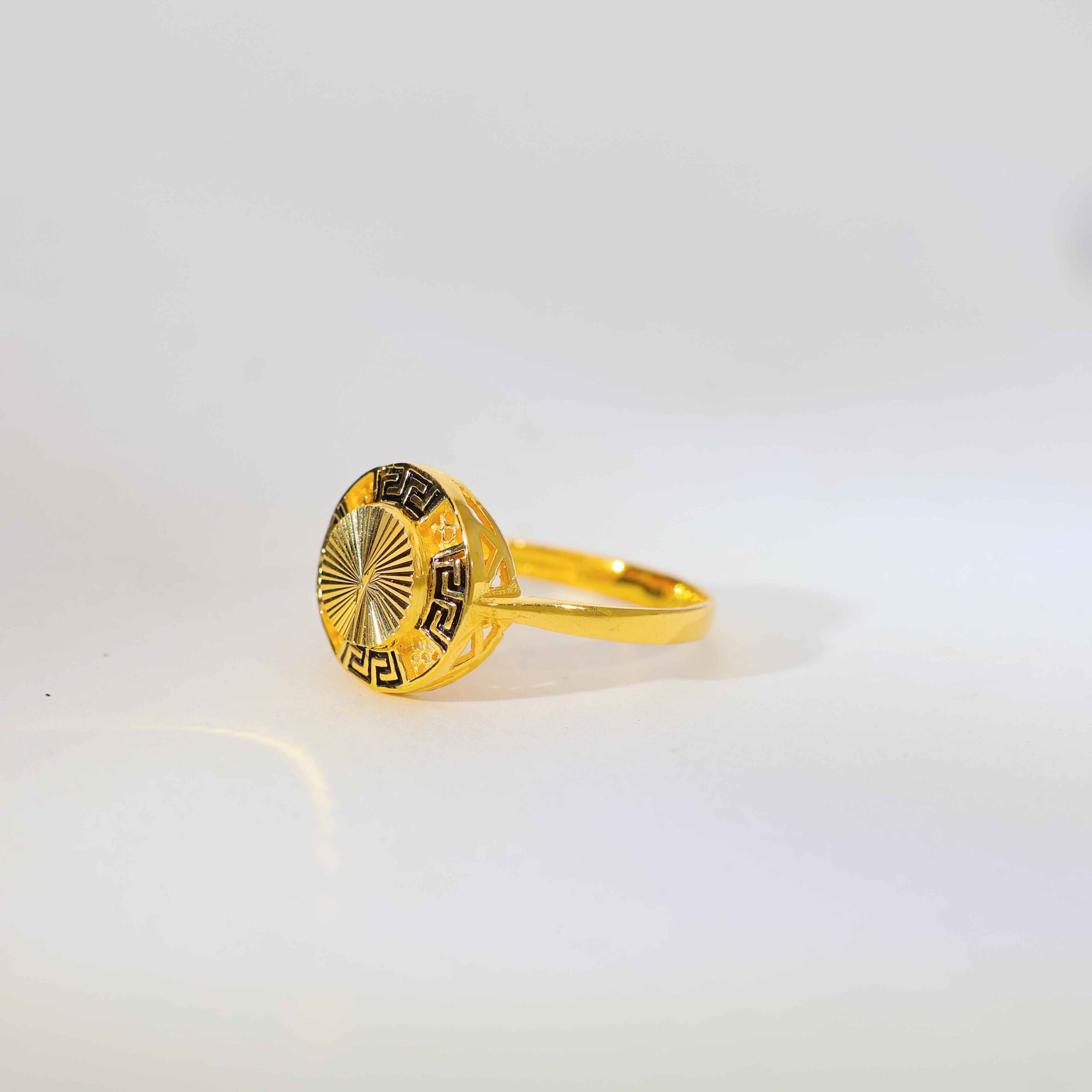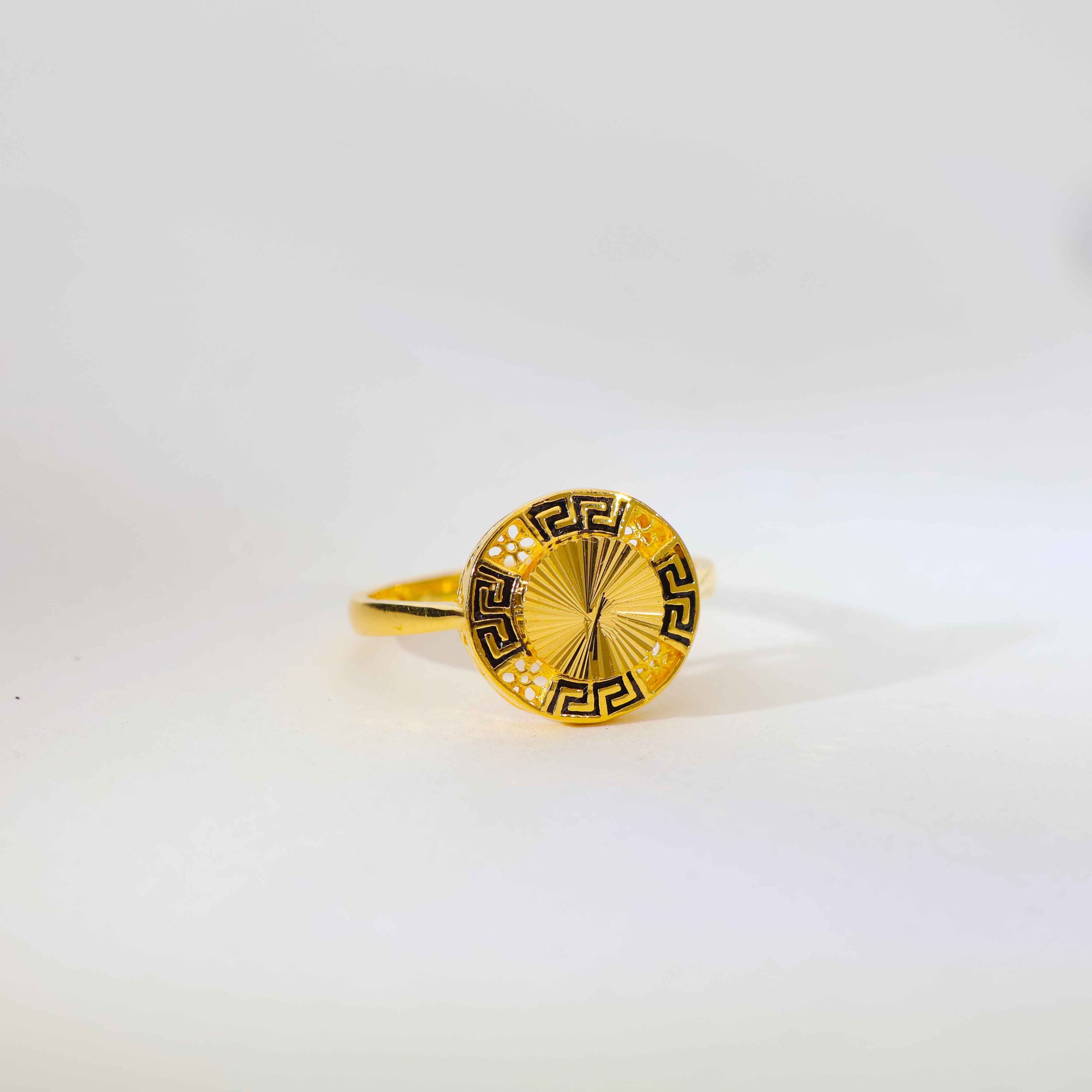 The ring features a sunburst engraved round centerpiece, surrounded by a black Greek key border with tiny open cut dots. Crafted in 22kt 916 gold, it has a polished and smooth band for all-day comfort.