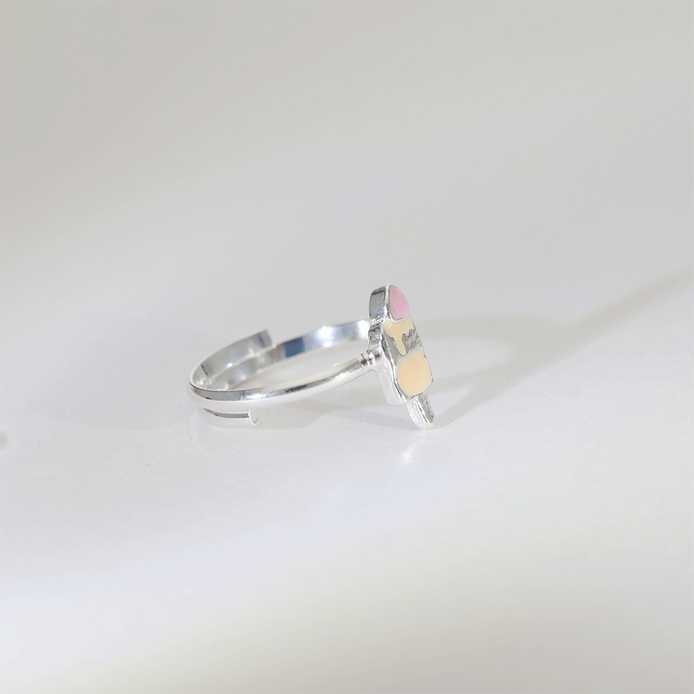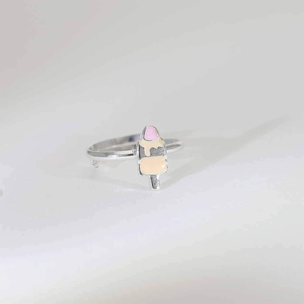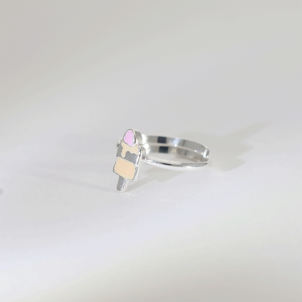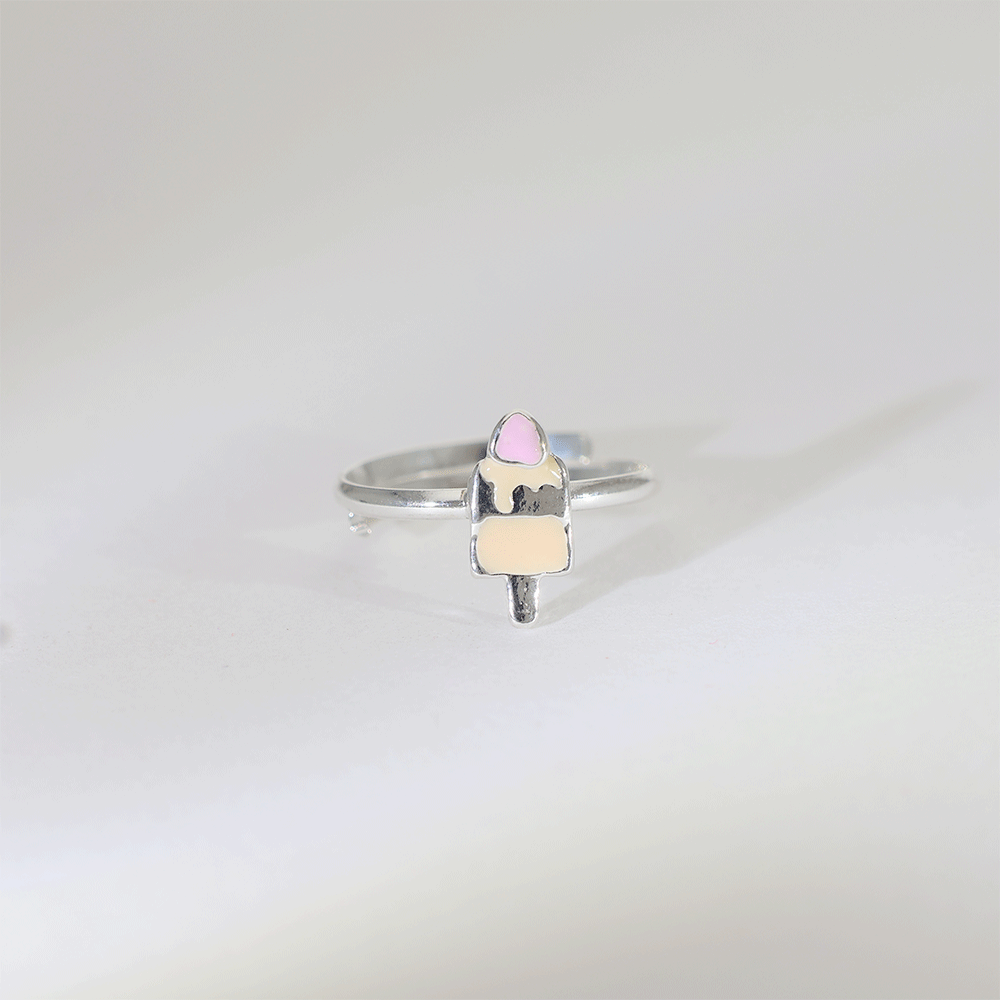 Design: A polished 92.5 silver baby ring featuring a cute ice cream popsicle charm with soft pink and cream enamel detailing.