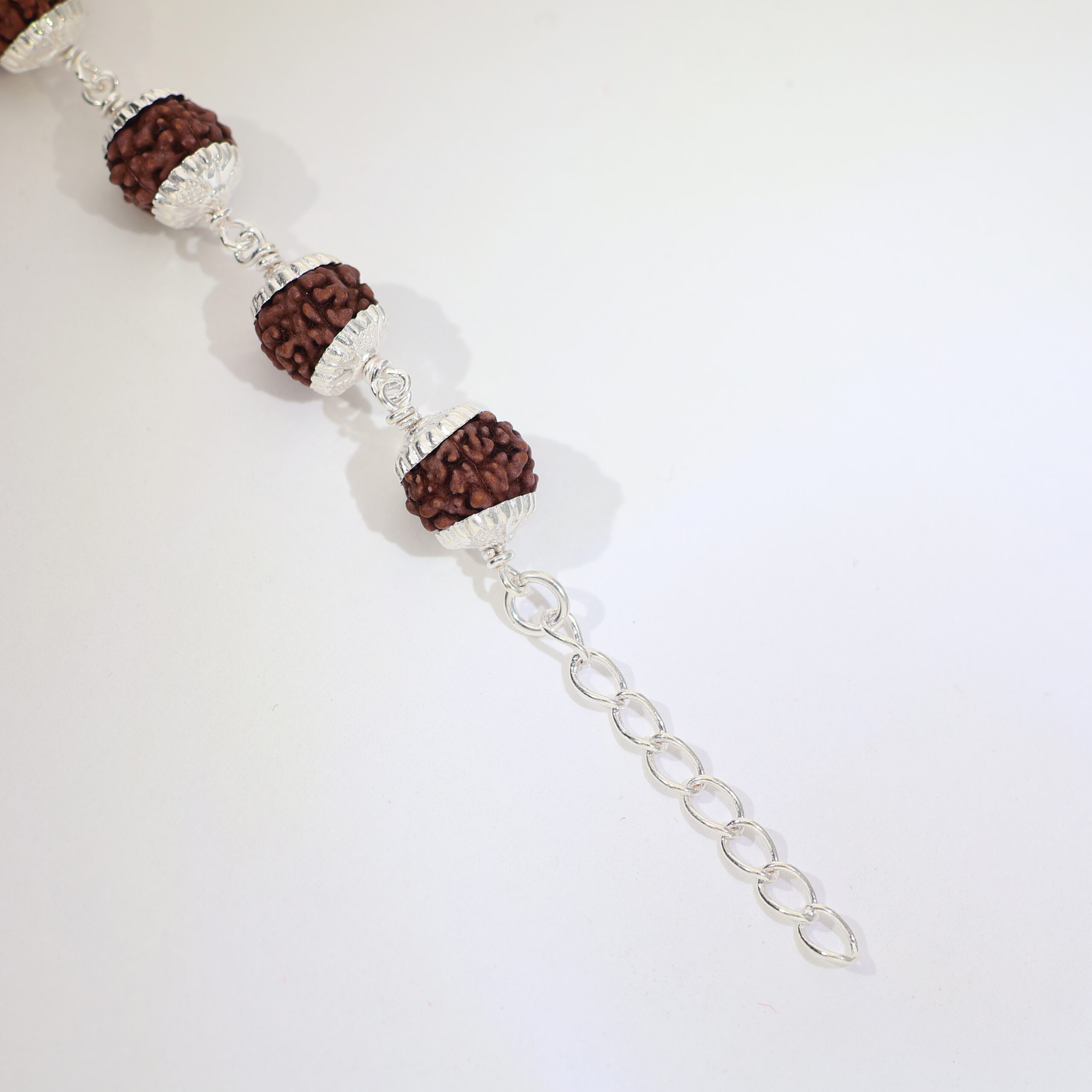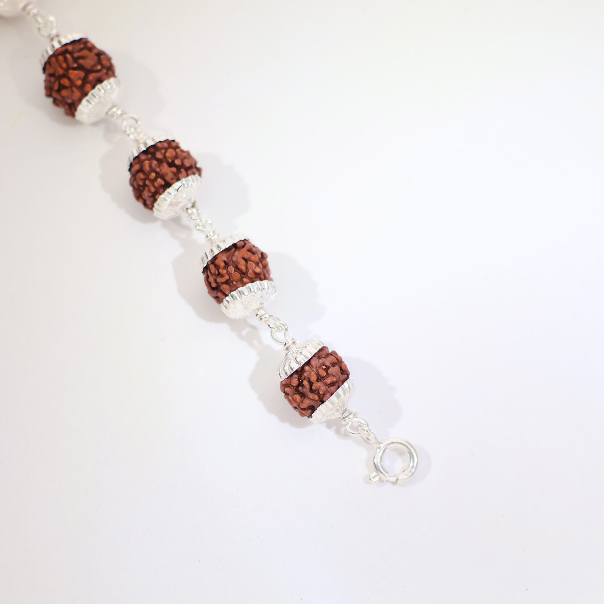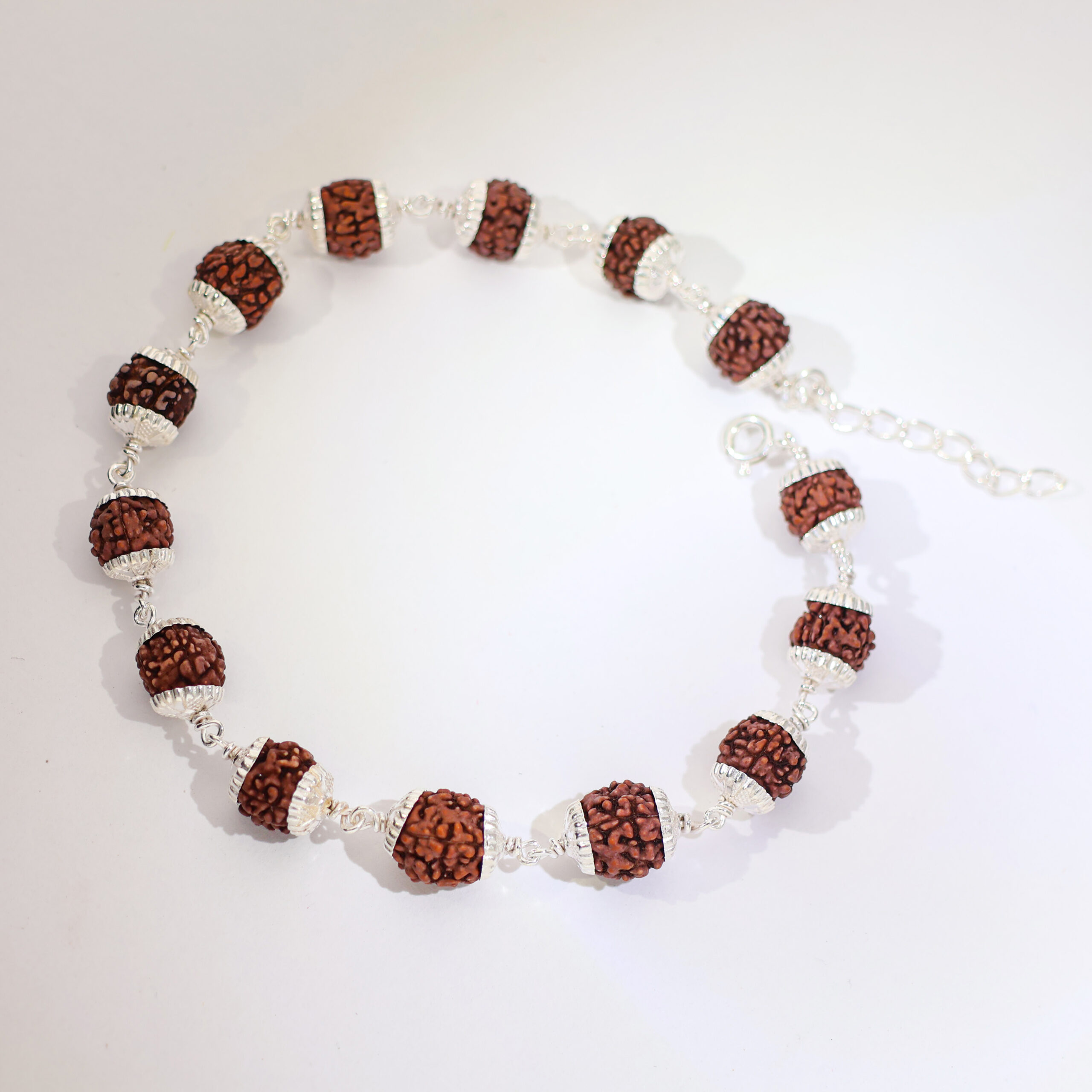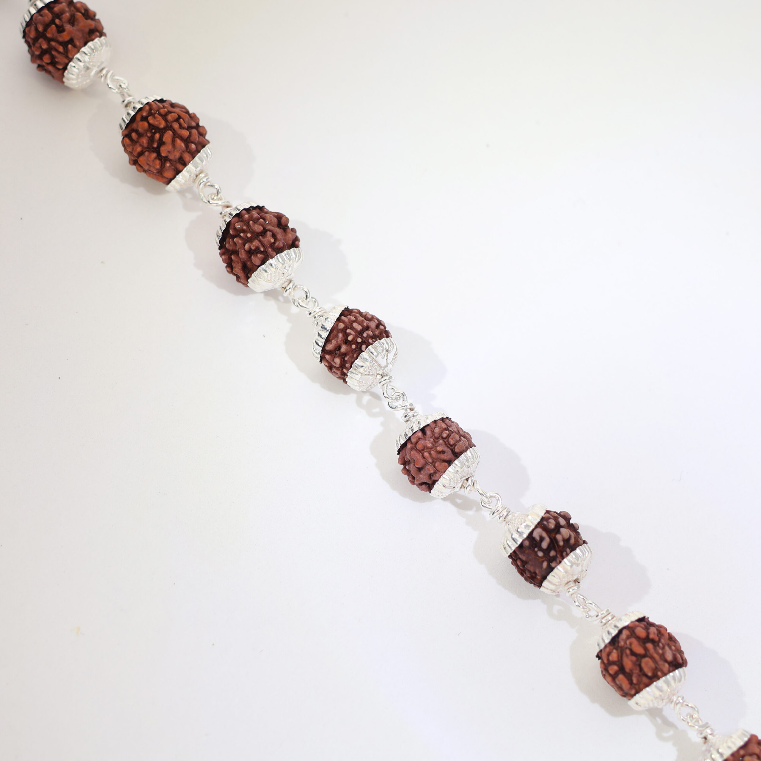 Even-sized Rudraksha beads held by textured 92.5 silver caps; secure clasp and flexible links for a relaxed fit.