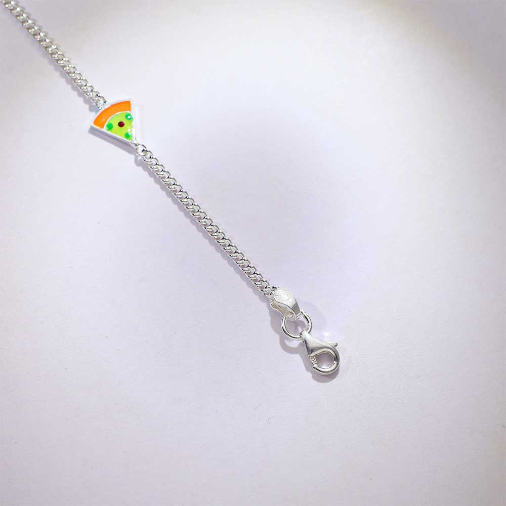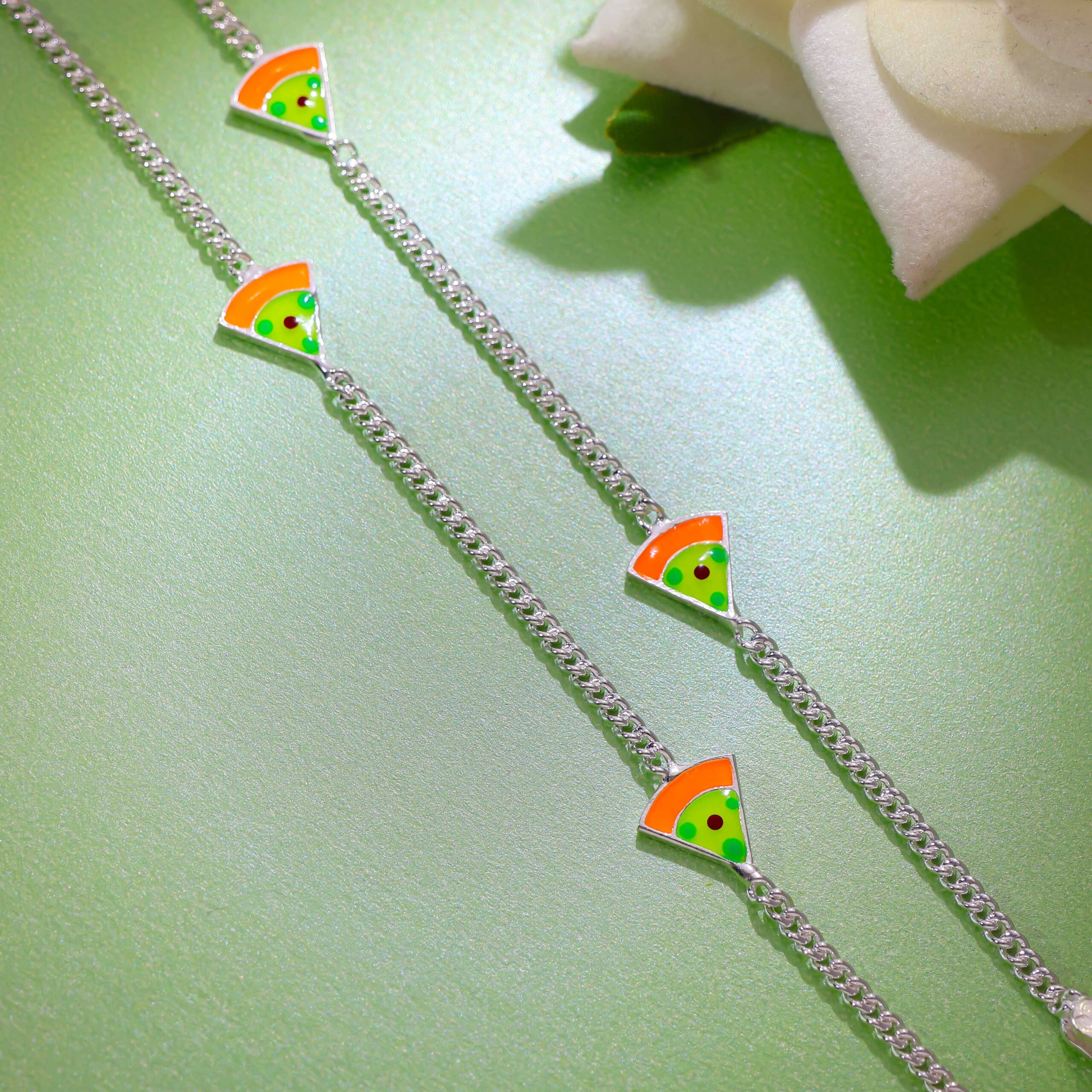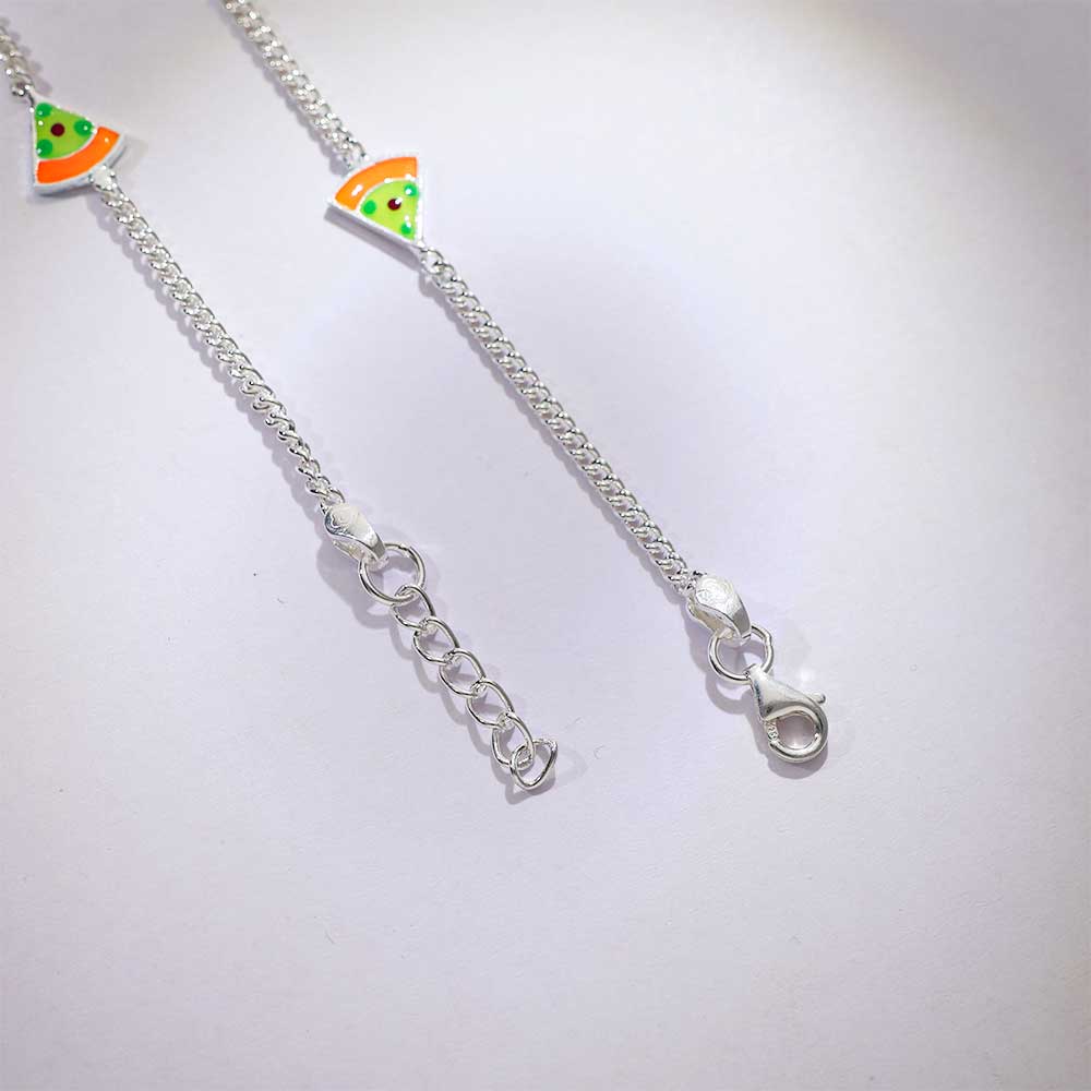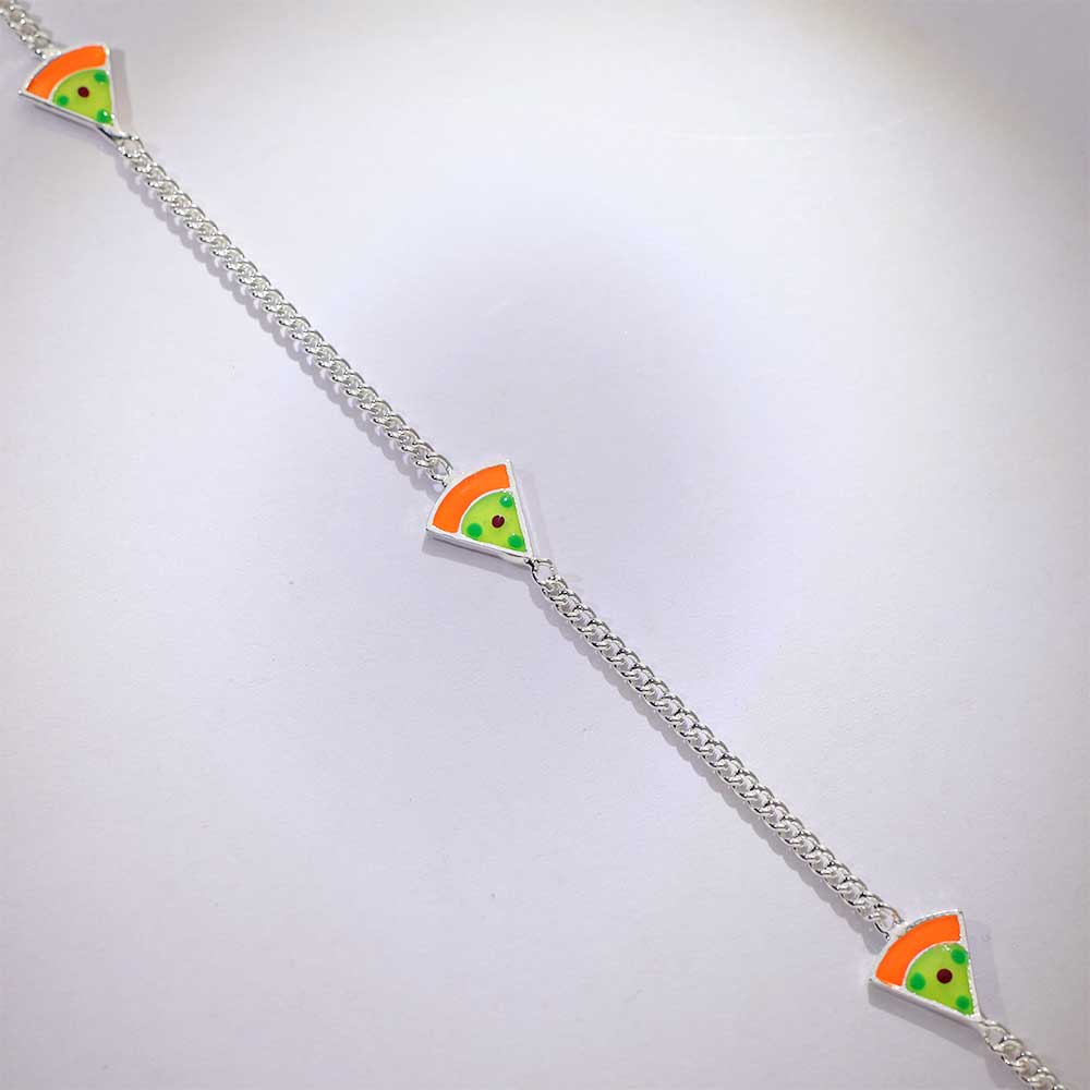 925 silver chains are dotted with vivid green and orange enamel charms shaped like watermelon slices. A playful, refreshing accessory for your baby’s growing journey.