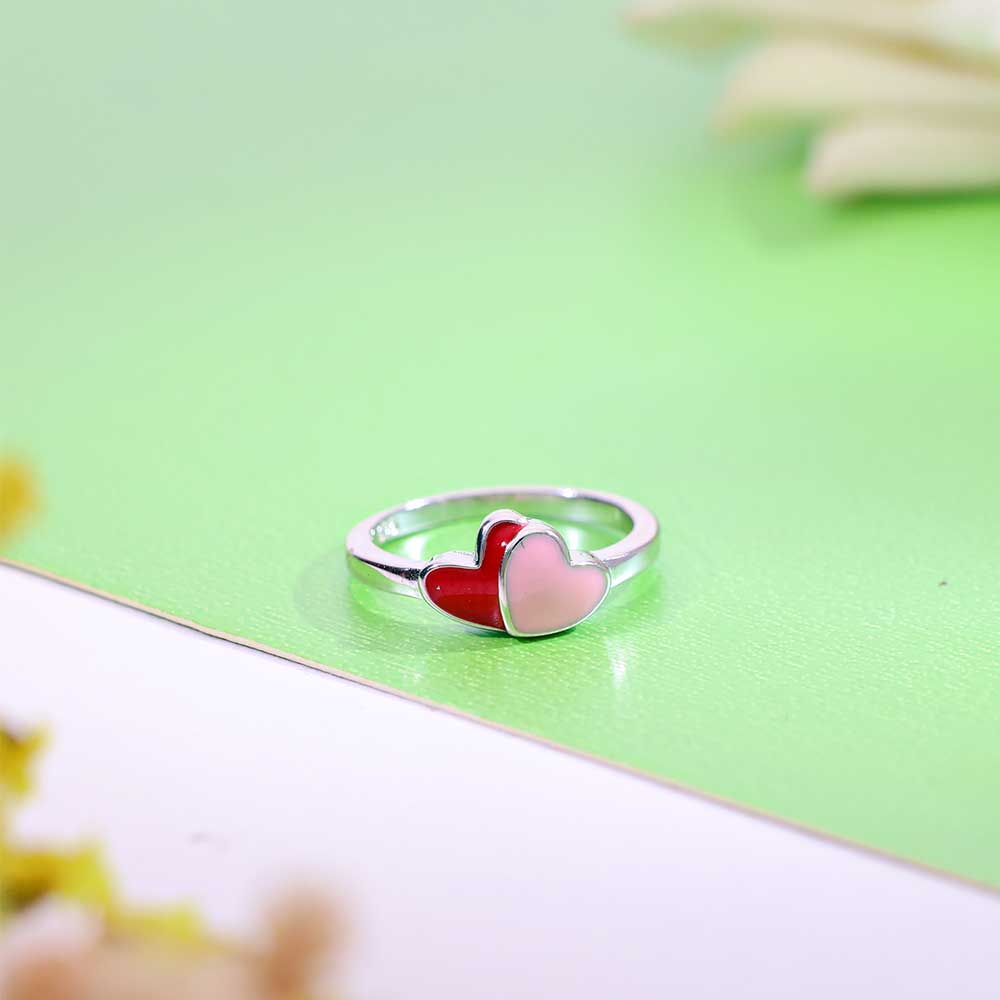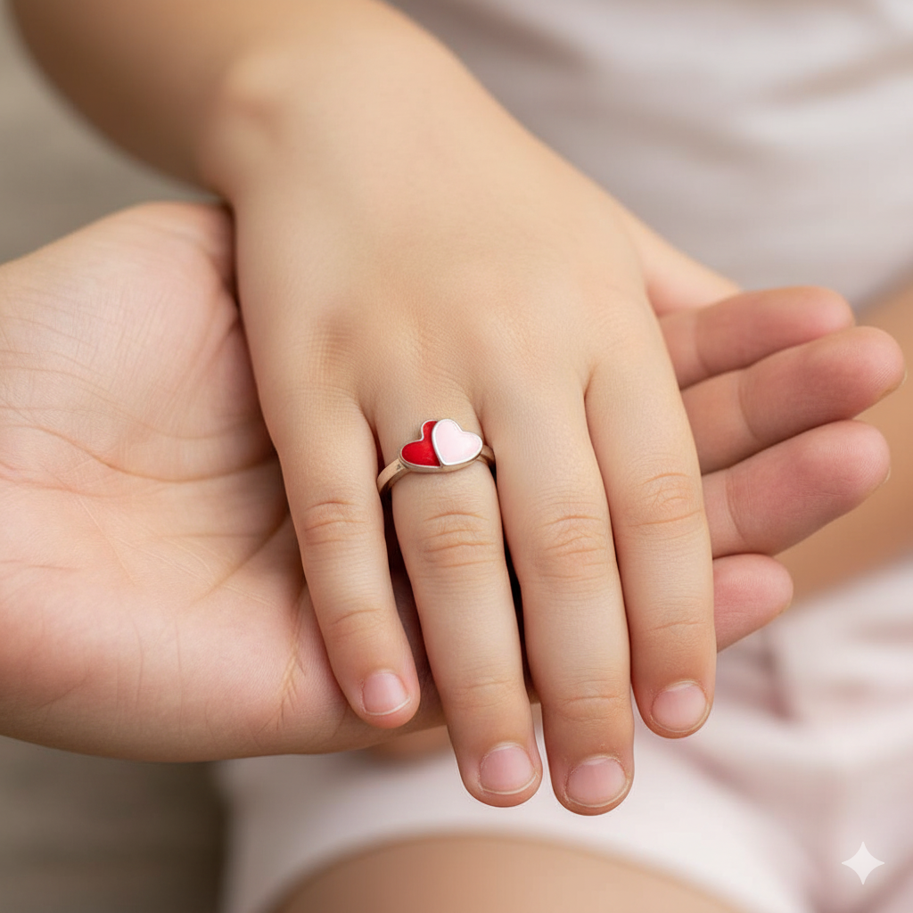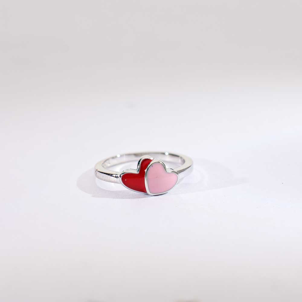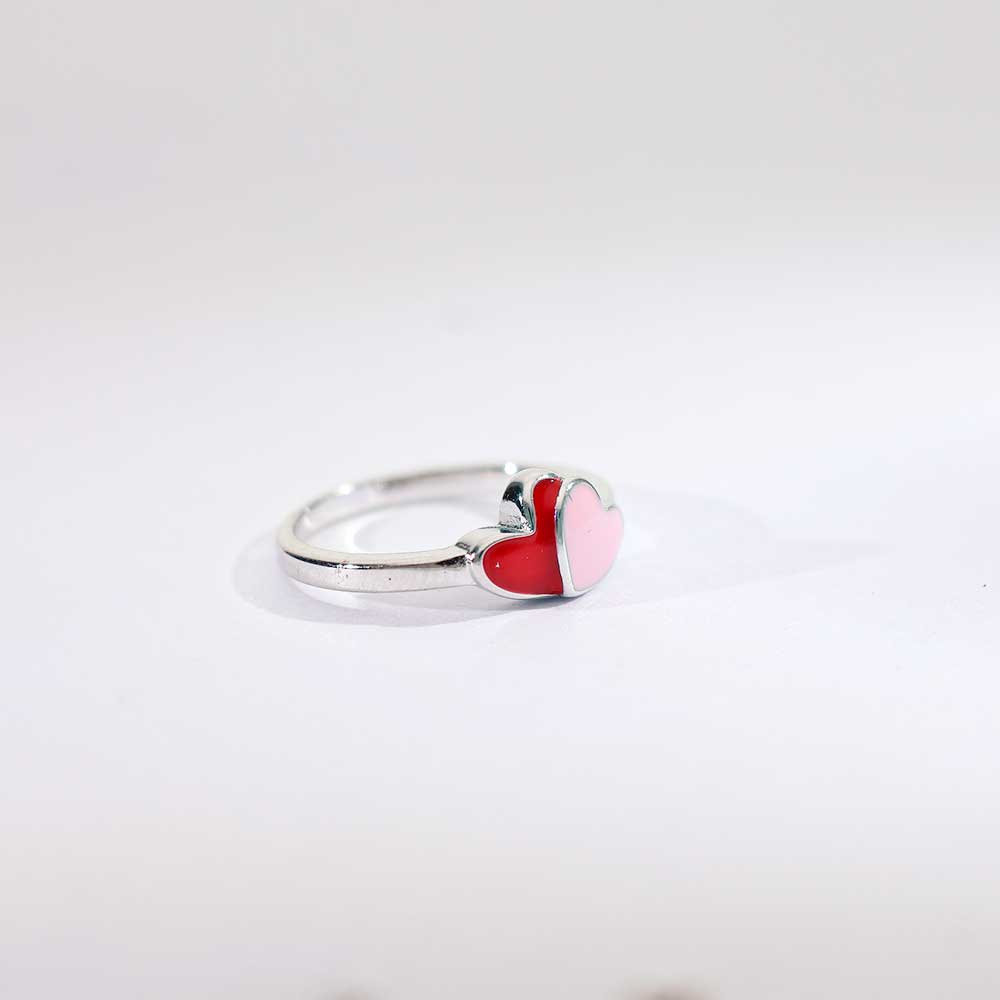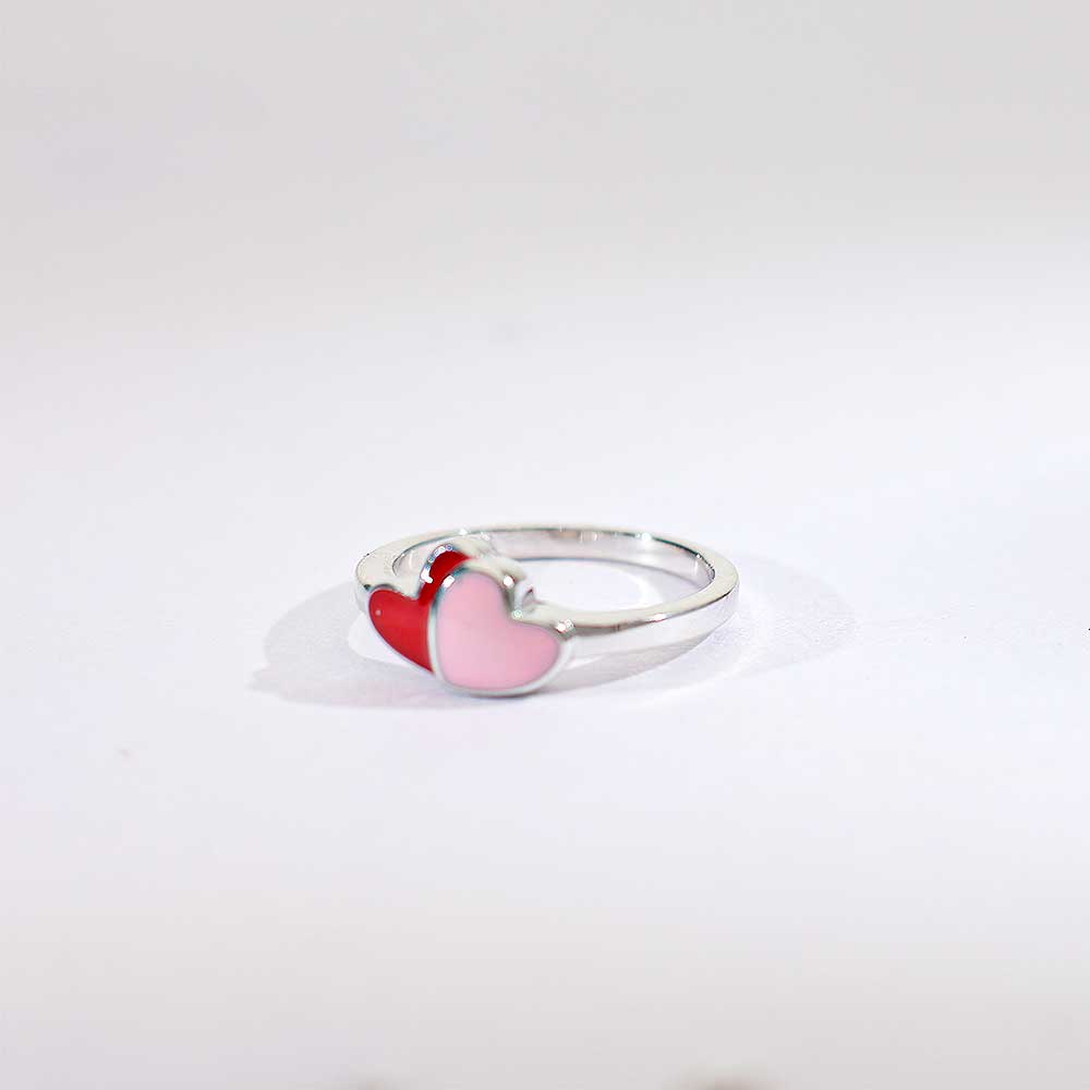 Design: Two petite enamel-filled hearts in pink and red sit side-by-side on a 925 silver band. A symbol of double love, made to rest gently on tiny fingers.