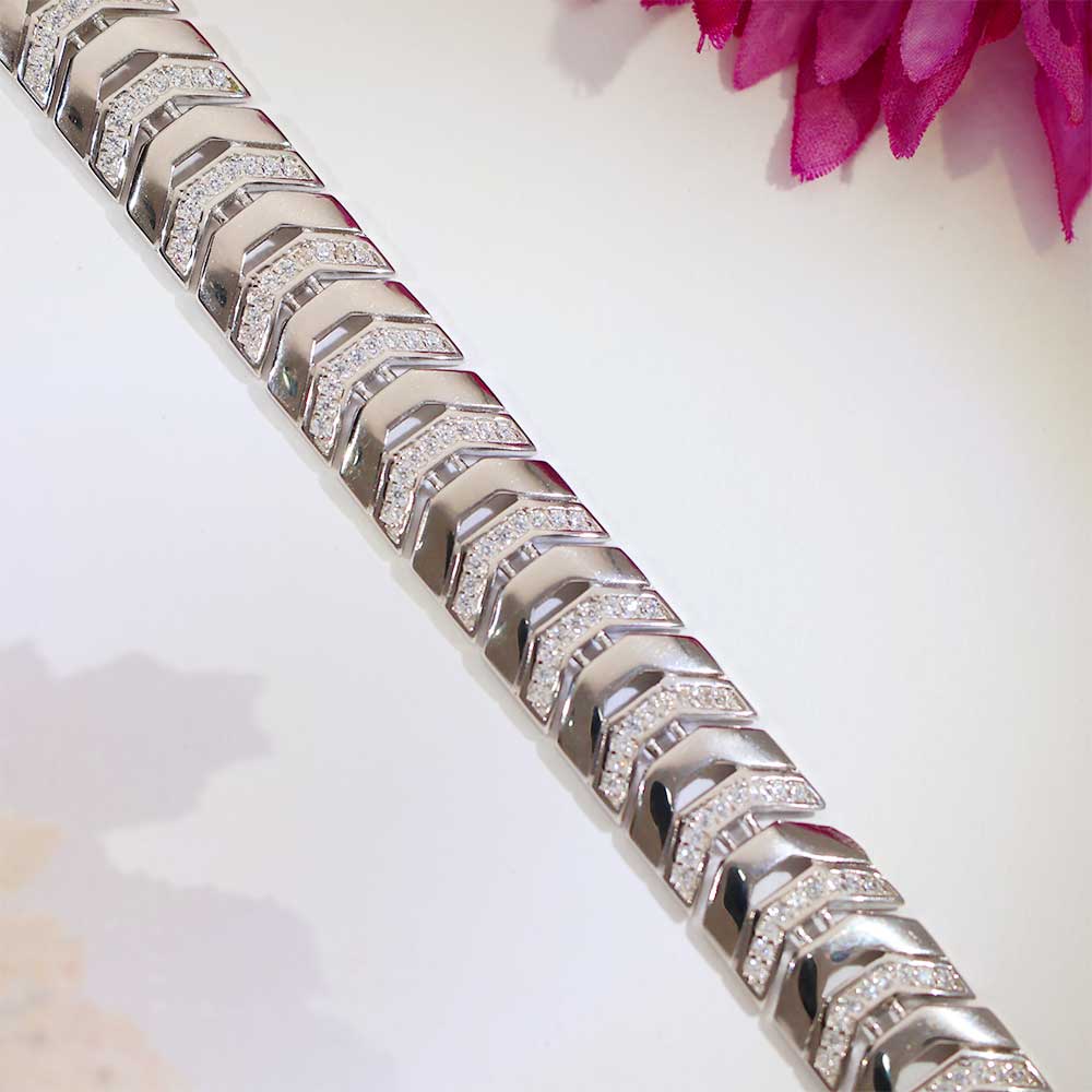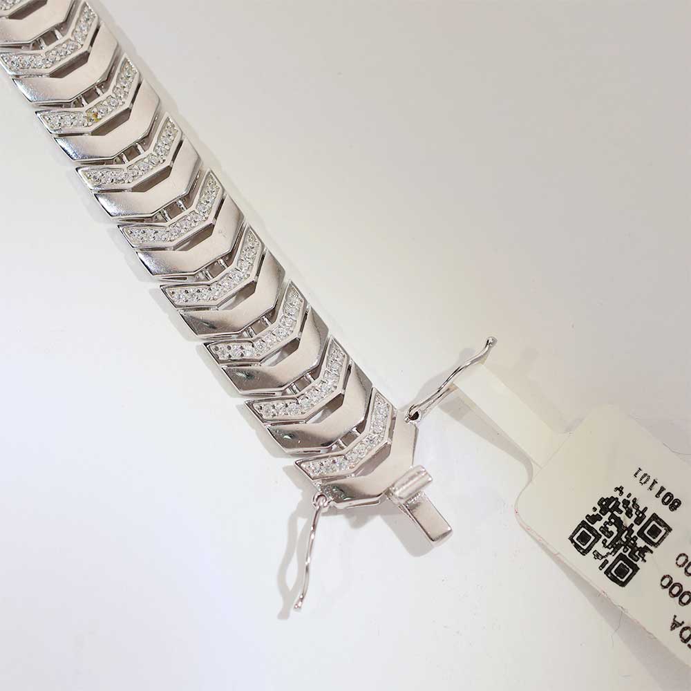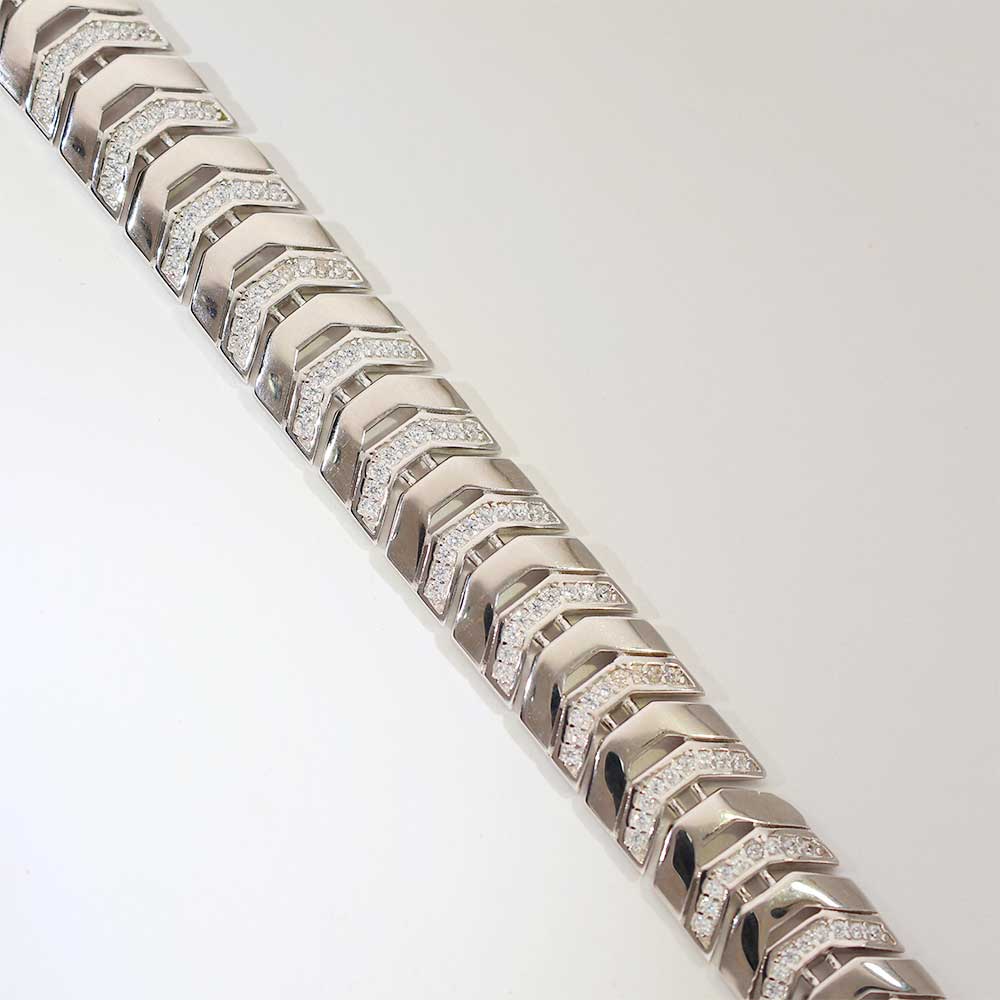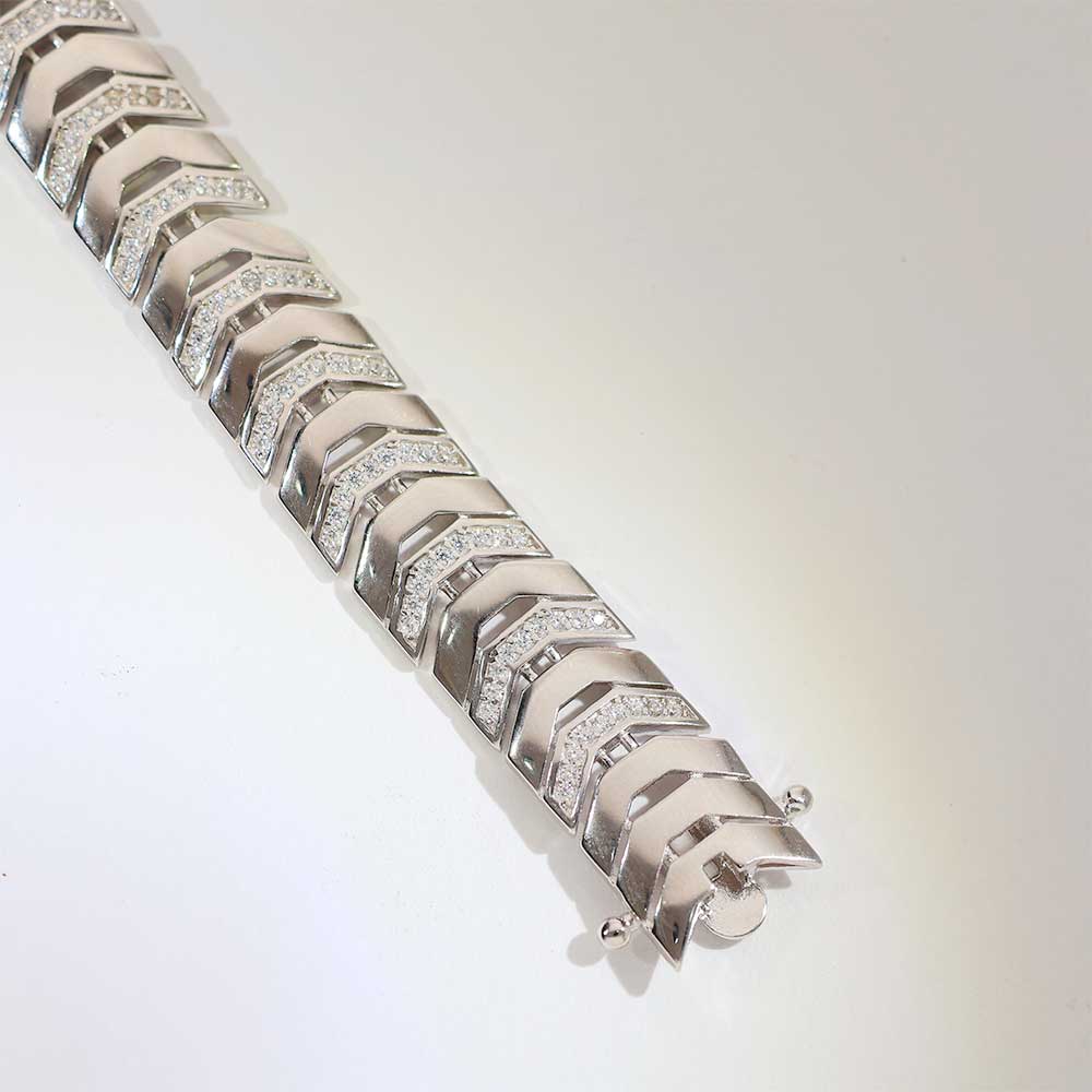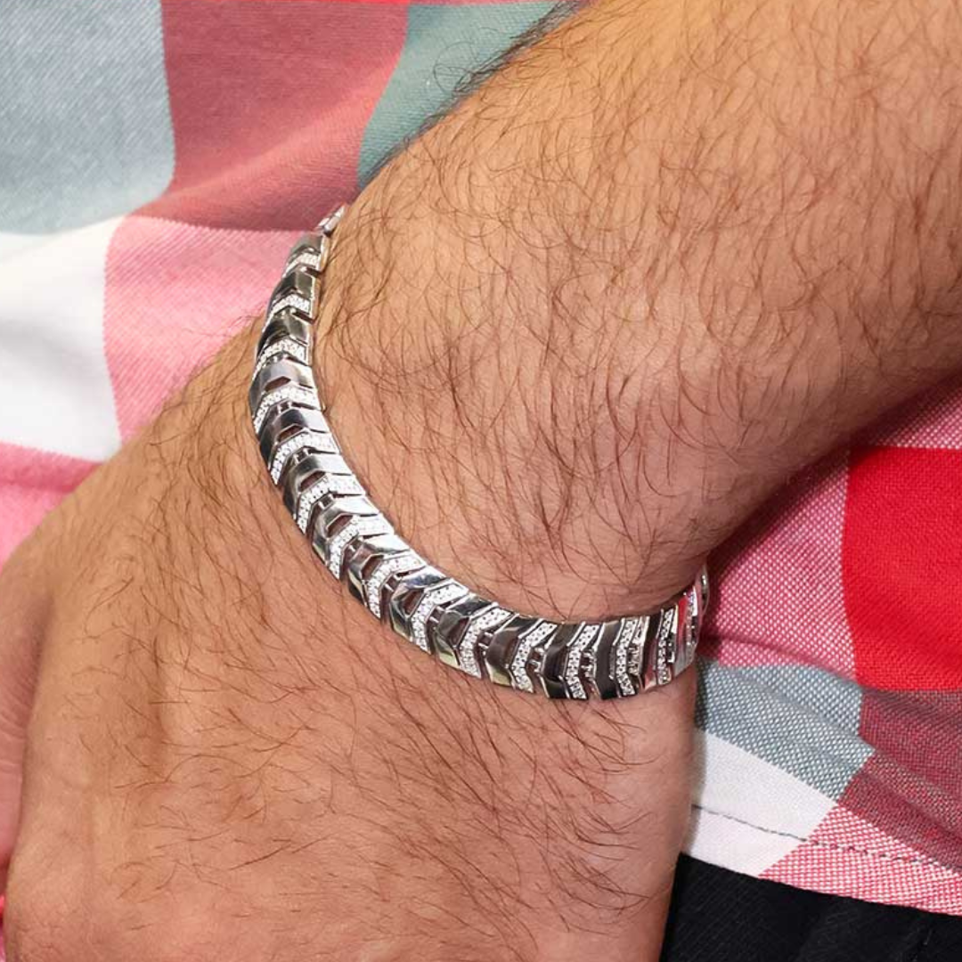 A sleek gents bracelet in rhodium 925 silver featuring V-track links and bright CZ accents for everyday class.