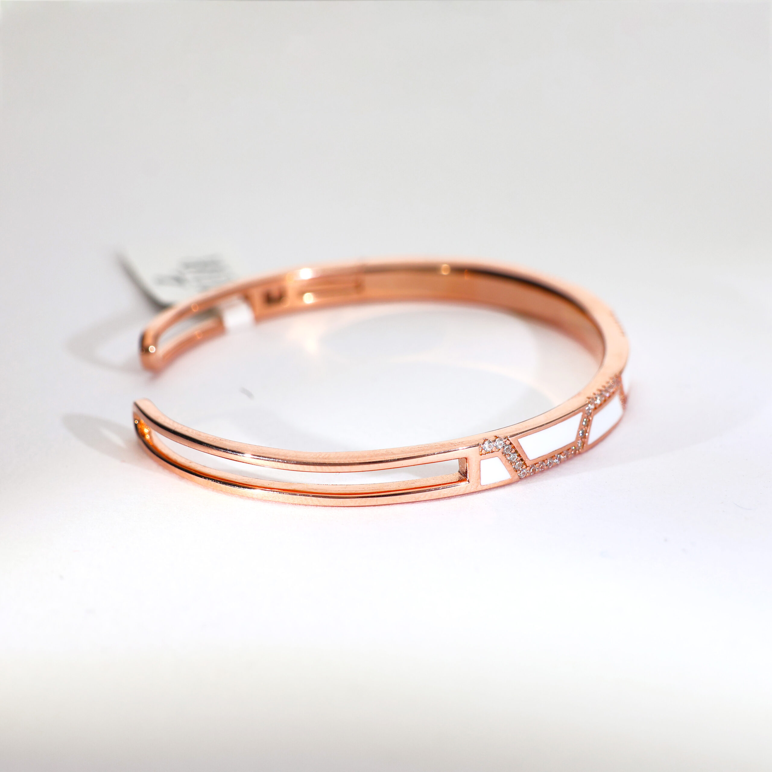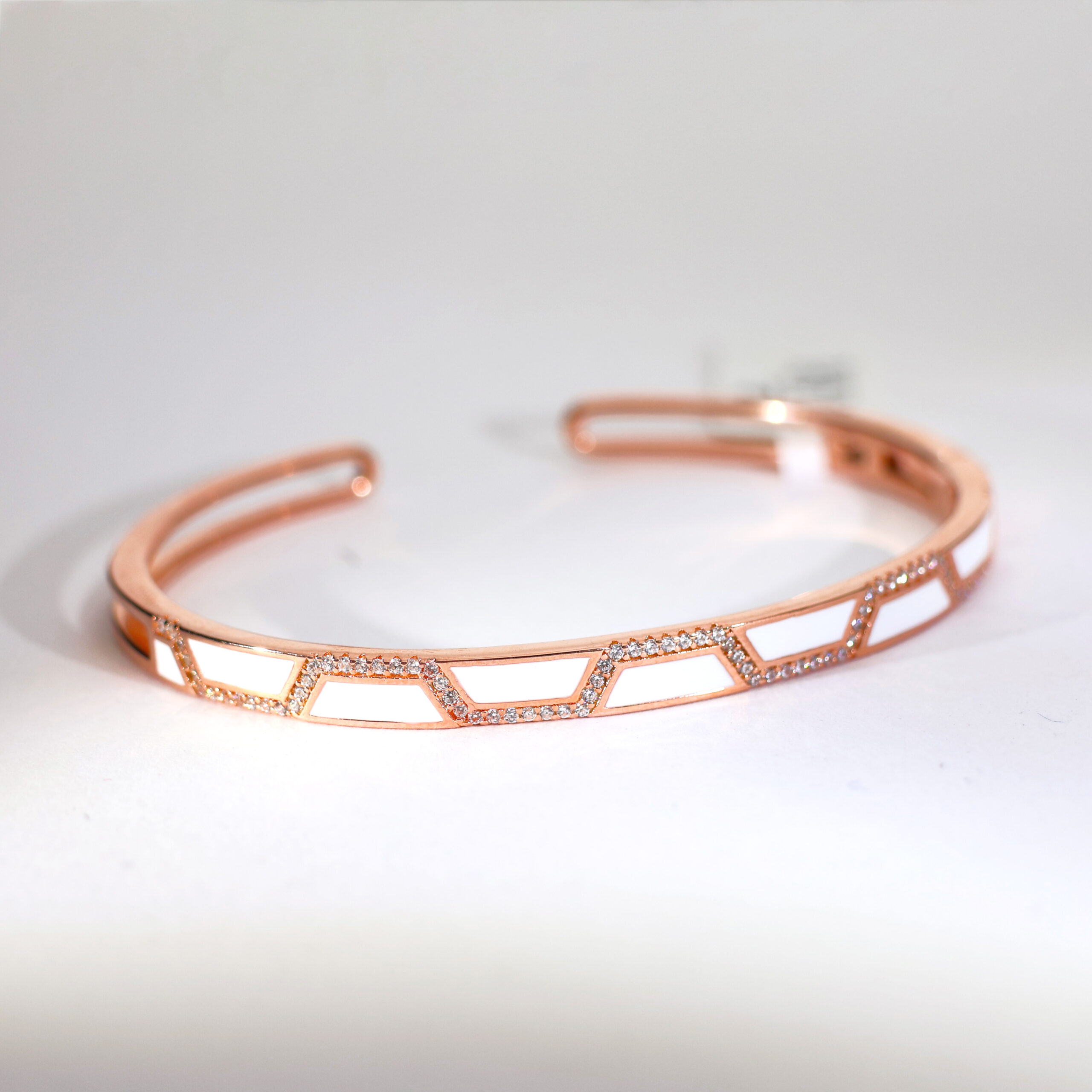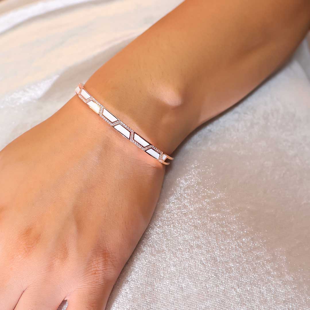 Design: Crafted with pure 92.5 Italian silver, this rosegold bracelet features sleek white enamel panels and sparkling pavé edges for modern refinement.