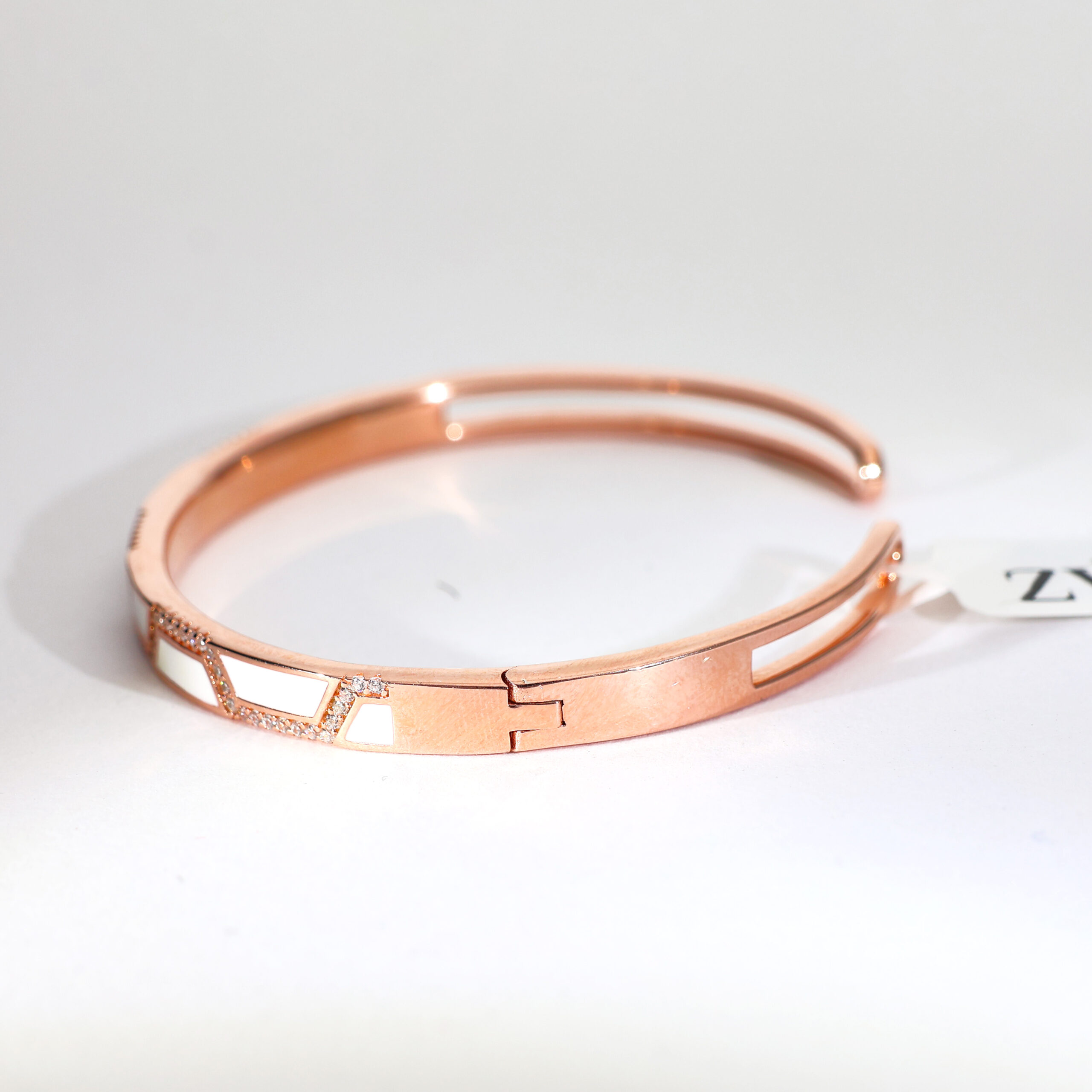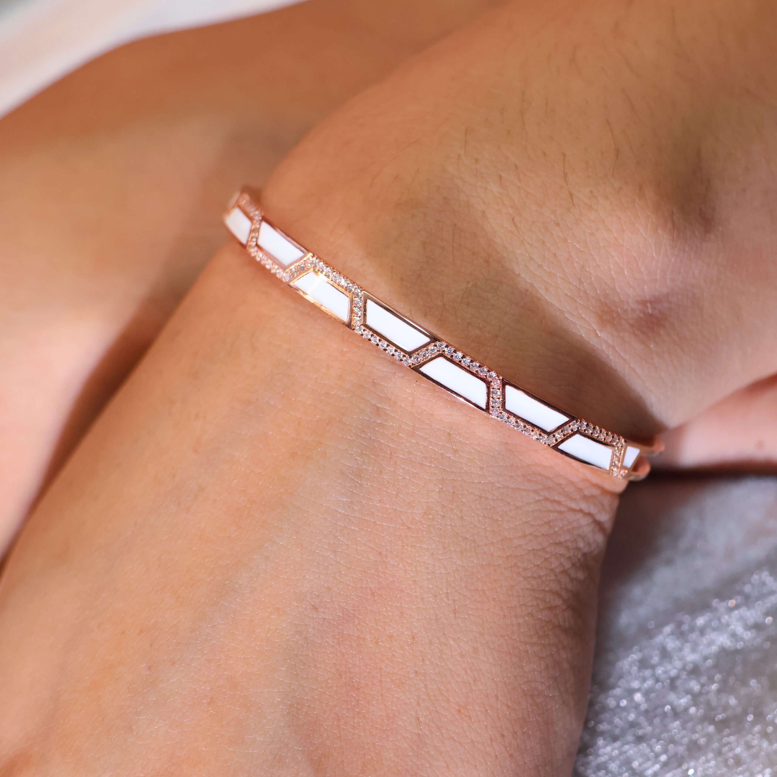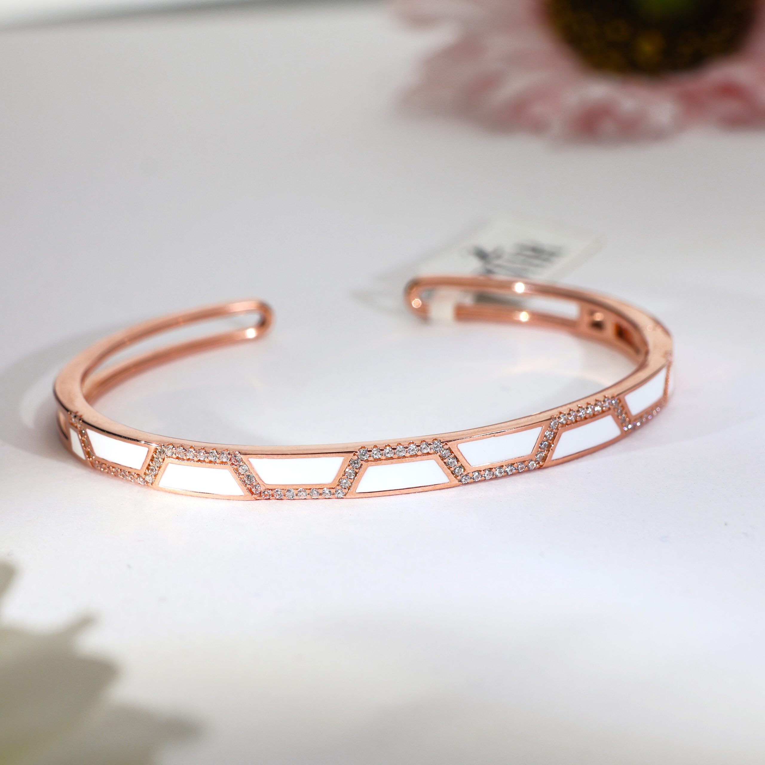 Design: Crafted with pure 92.5 Italian silver, this rosegold bracelet features sleek white enamel panels and sparkling pavé edges for modern refinement.